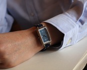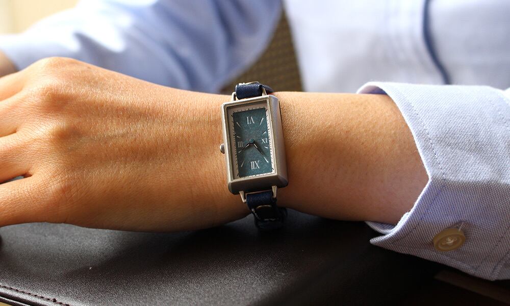 約3.3センチ×約2.3センチのややコンパクトな矩形の時計本体と、シンプルながら飽きのこない文字盤は、必要以上のモノを求めない洗練された雰囲気を持つ人に与えてくれます。