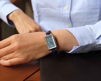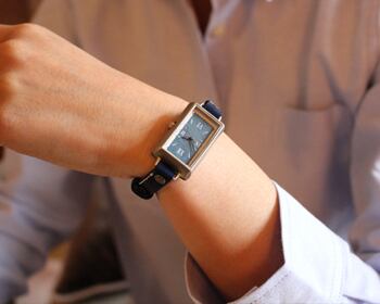 四角い矩形のフォルムにシンプルな文字盤を合わせたクラシックな腕時計。