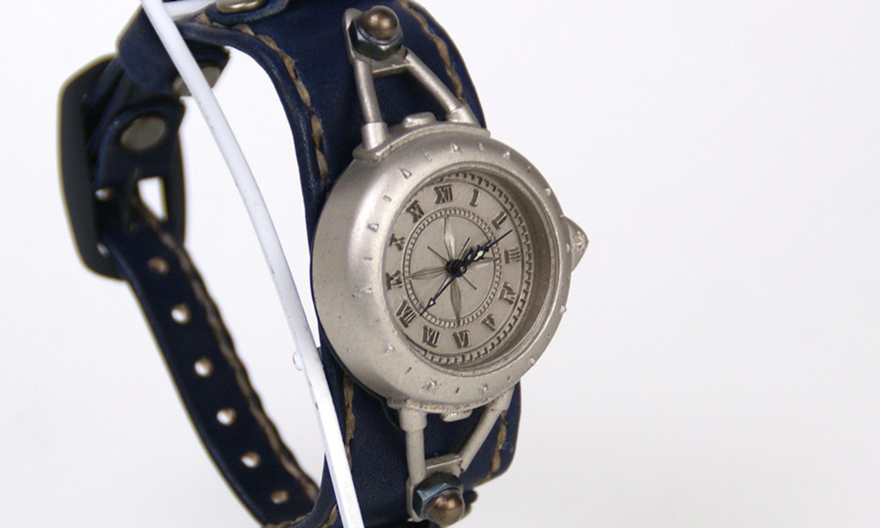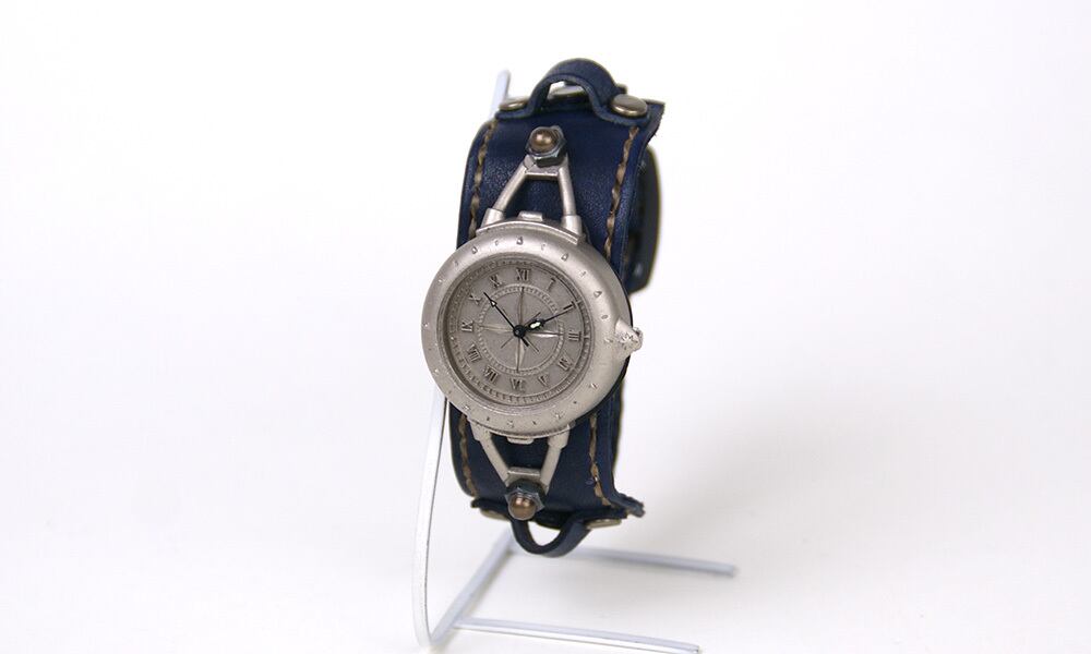 羅針盤をイメージした文字盤と、細めのスポーティーな革バングルのバングルウォッチです。