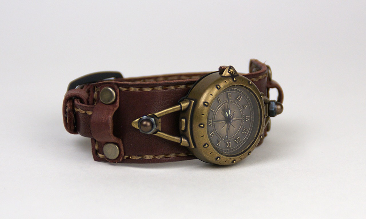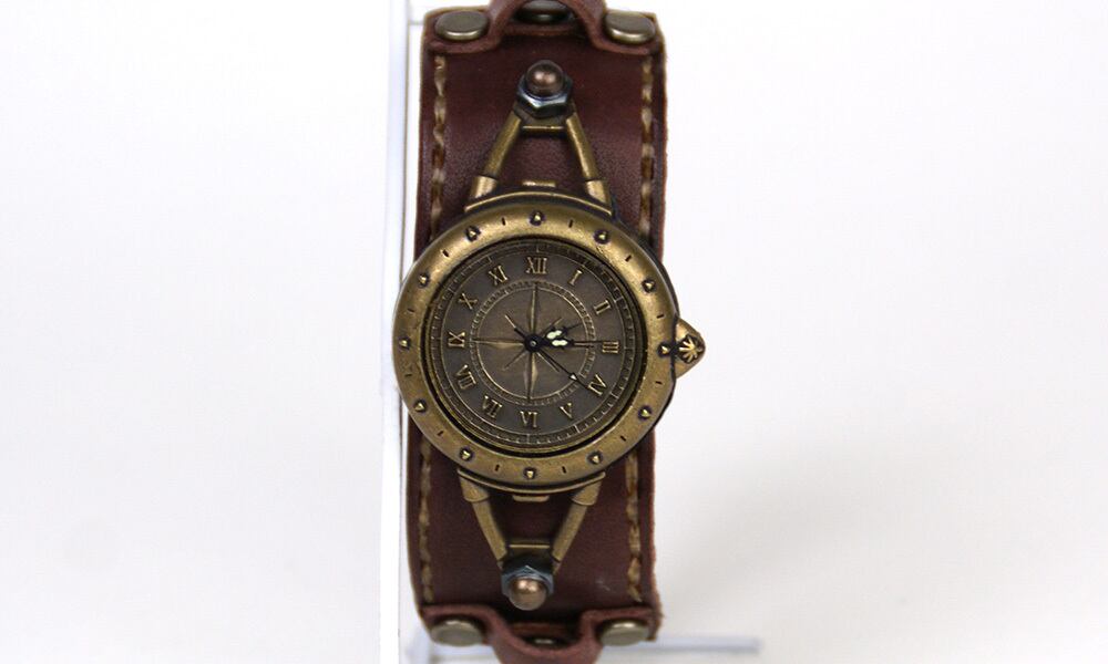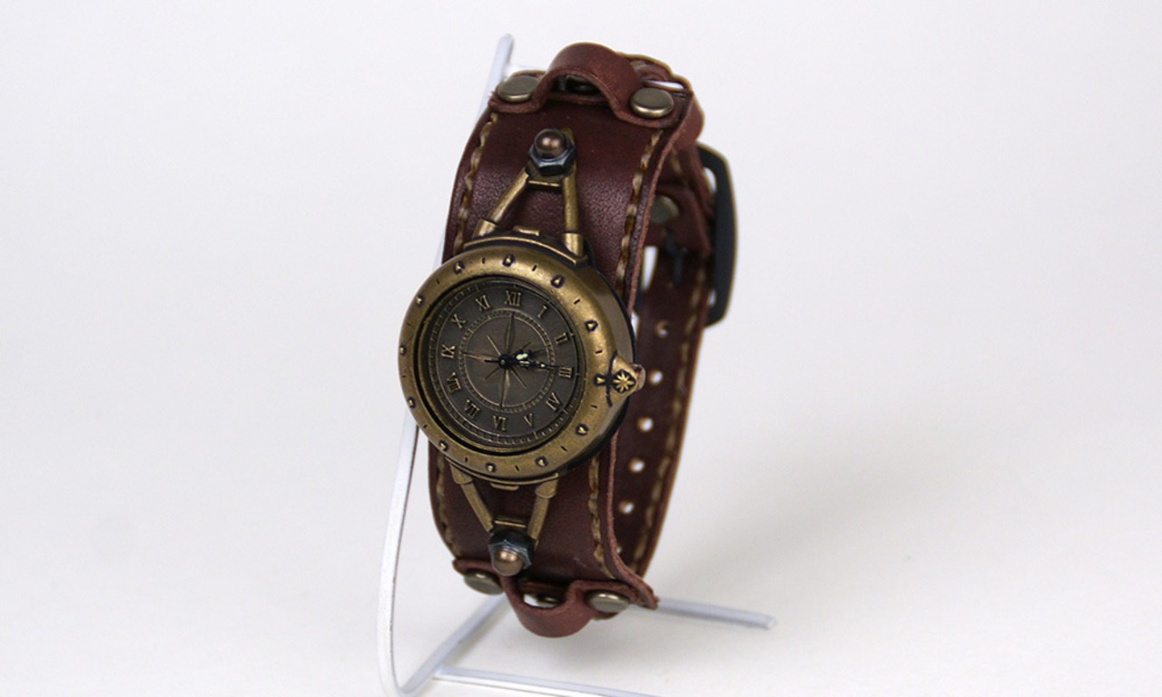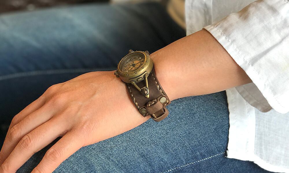 羅針盤をイメージした文字盤と、細めのスポーティーな革バングルのバングルウォッチです。