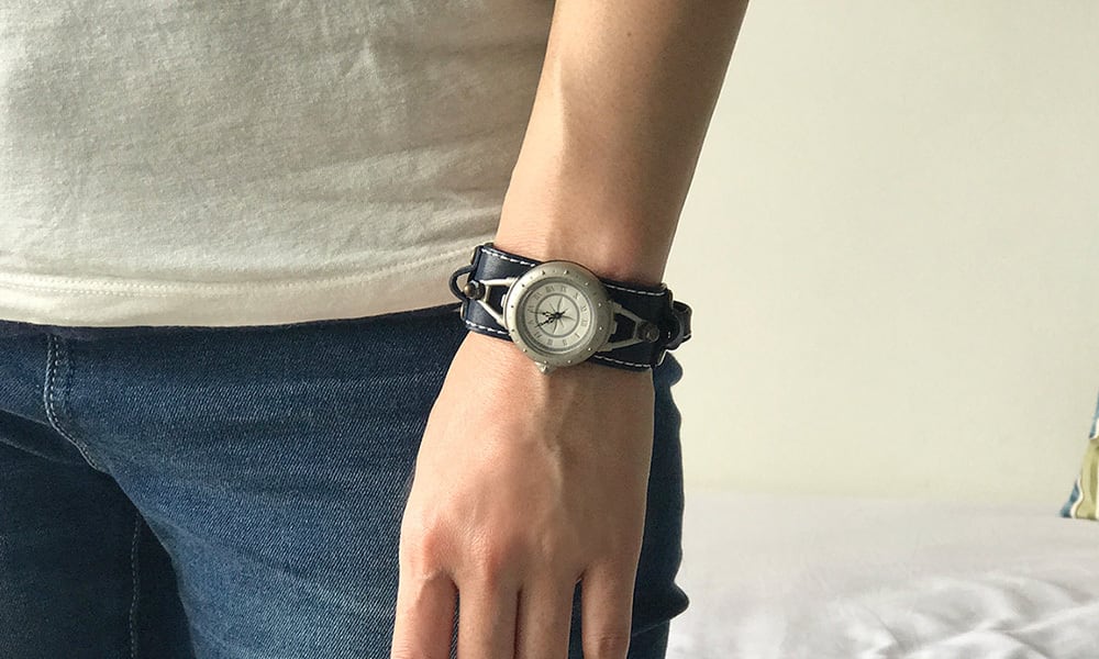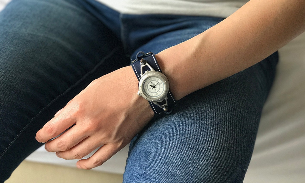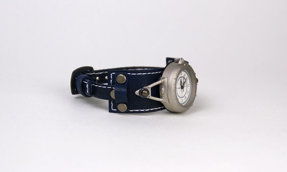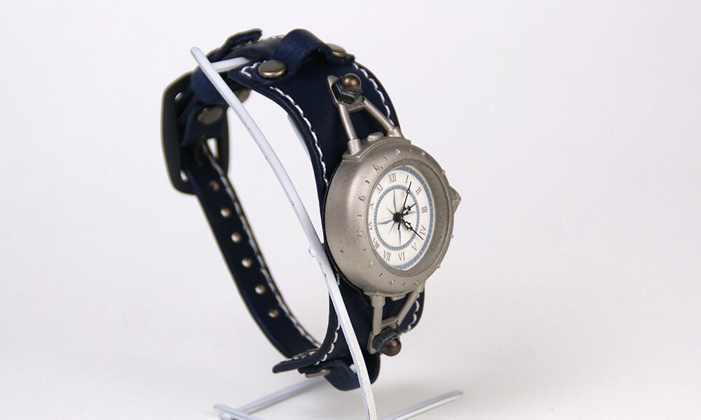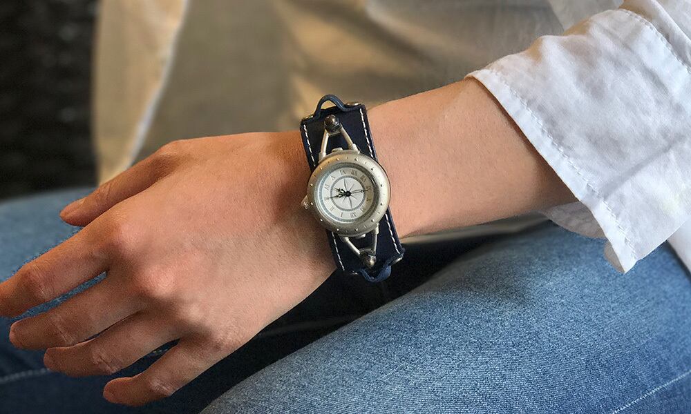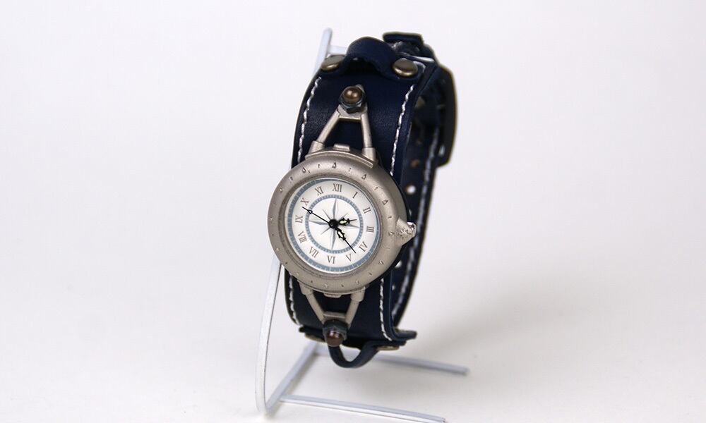 羅針盤をイメージした文字盤と、細めのスポーティーな革バングルのバングルウォッチです。