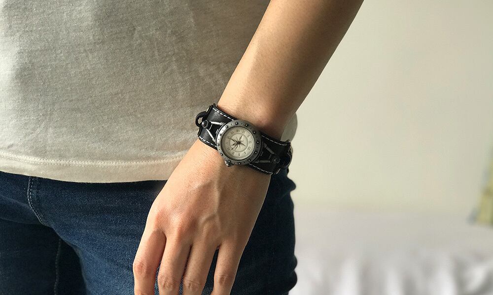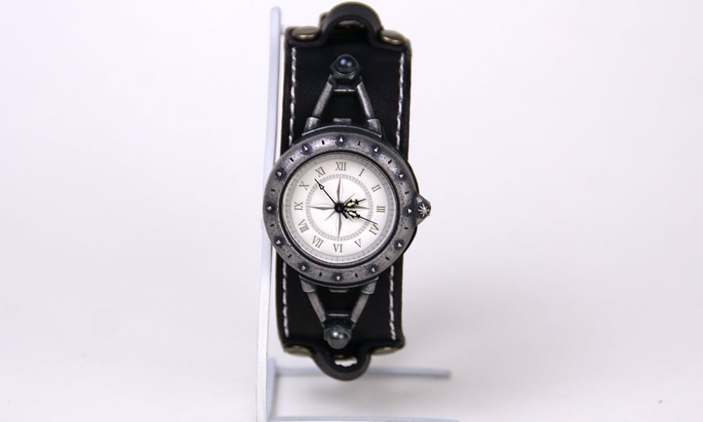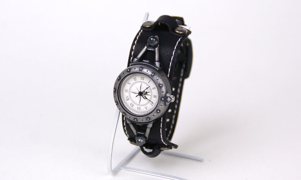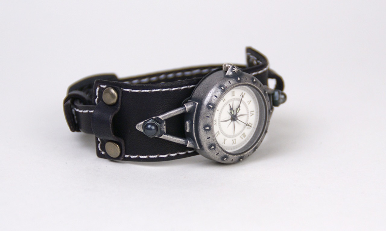 羅針盤をイメージした文字盤と、細めのスポーティーな革バングルのバングルウォッチです。