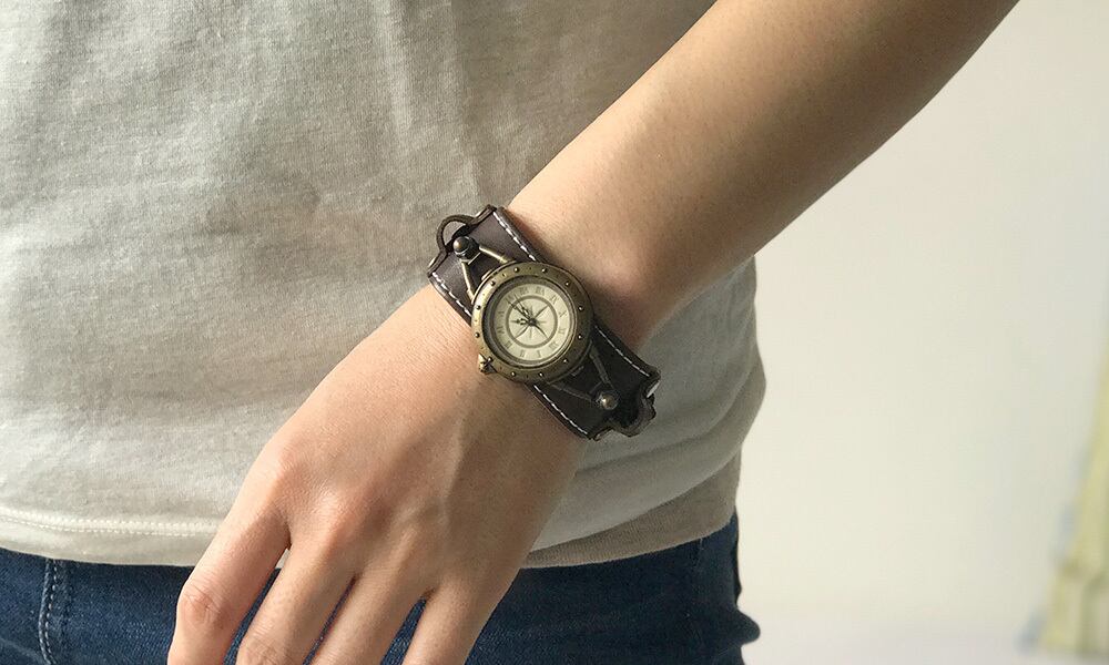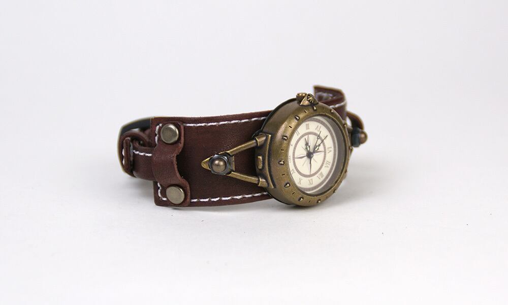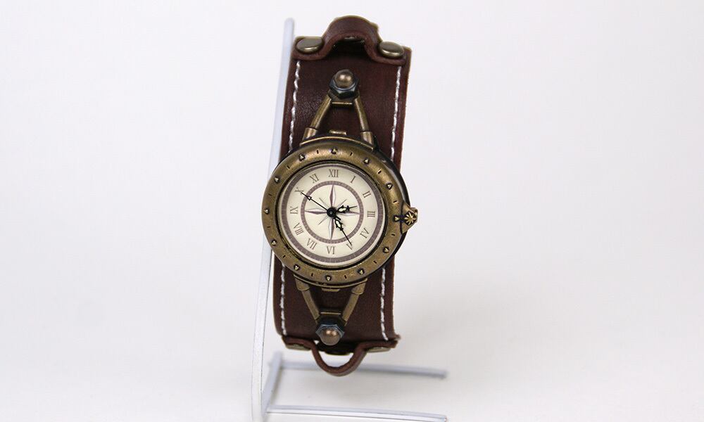 羅針盤をイメージした文字盤と、細めのスポーティーな革バングルのバングルウォッチです。