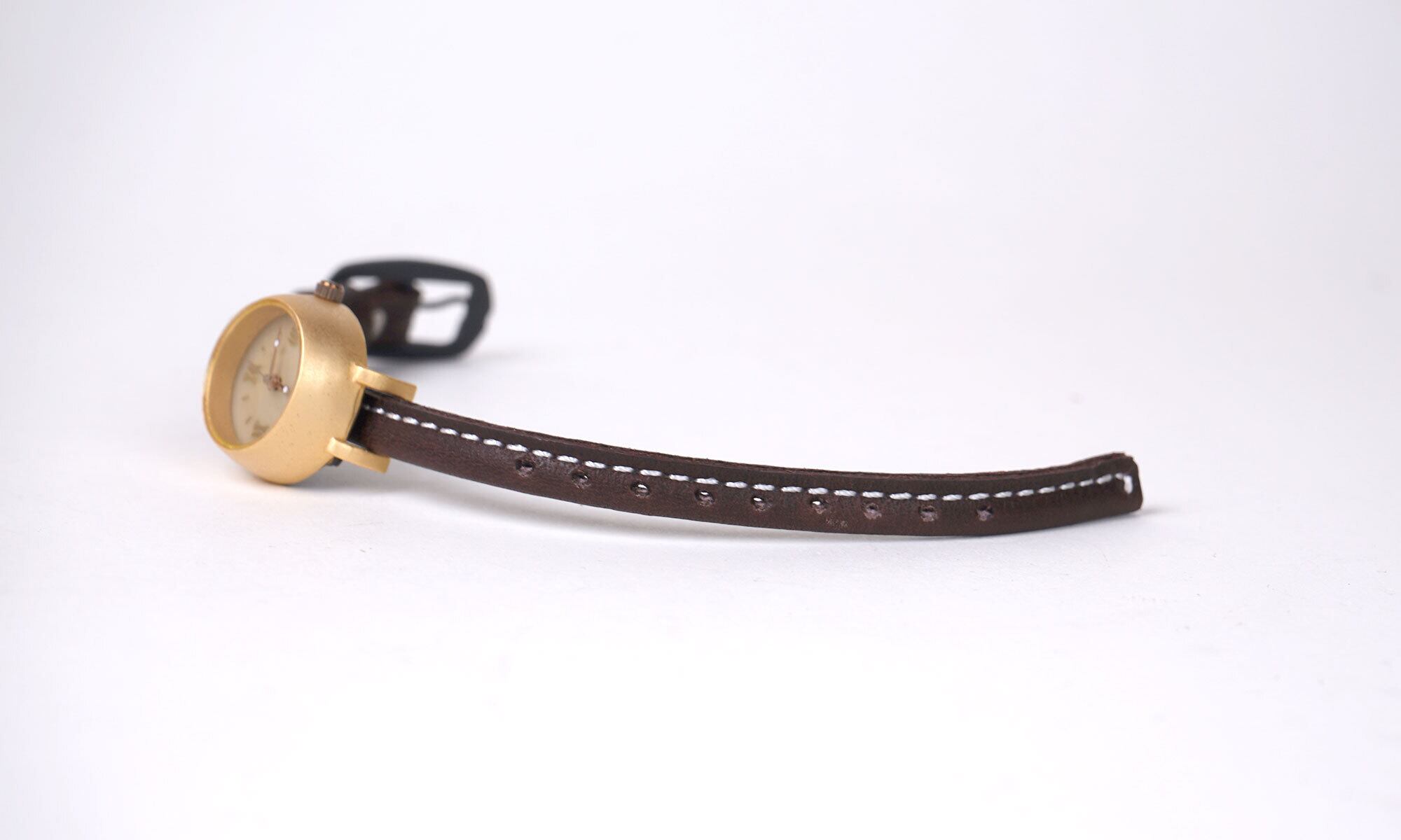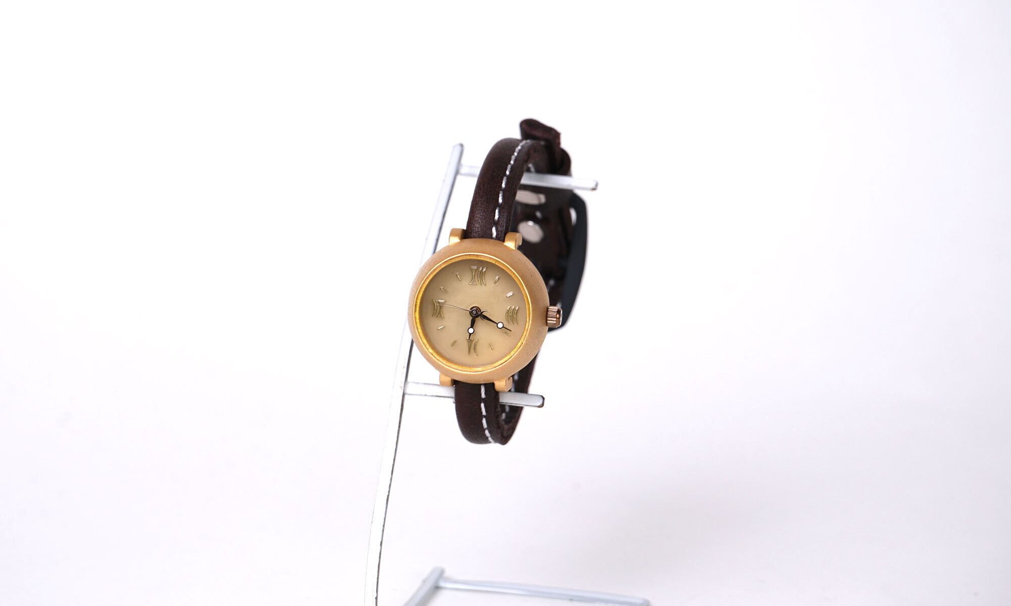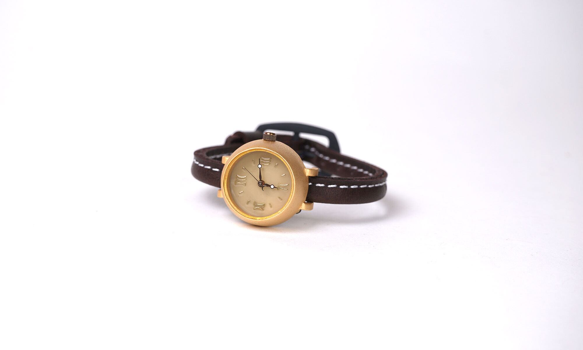 「時計本体」・・・丸窓をモチーフにした時計本体は、落ち着いたマットゴールドに仕上げています。