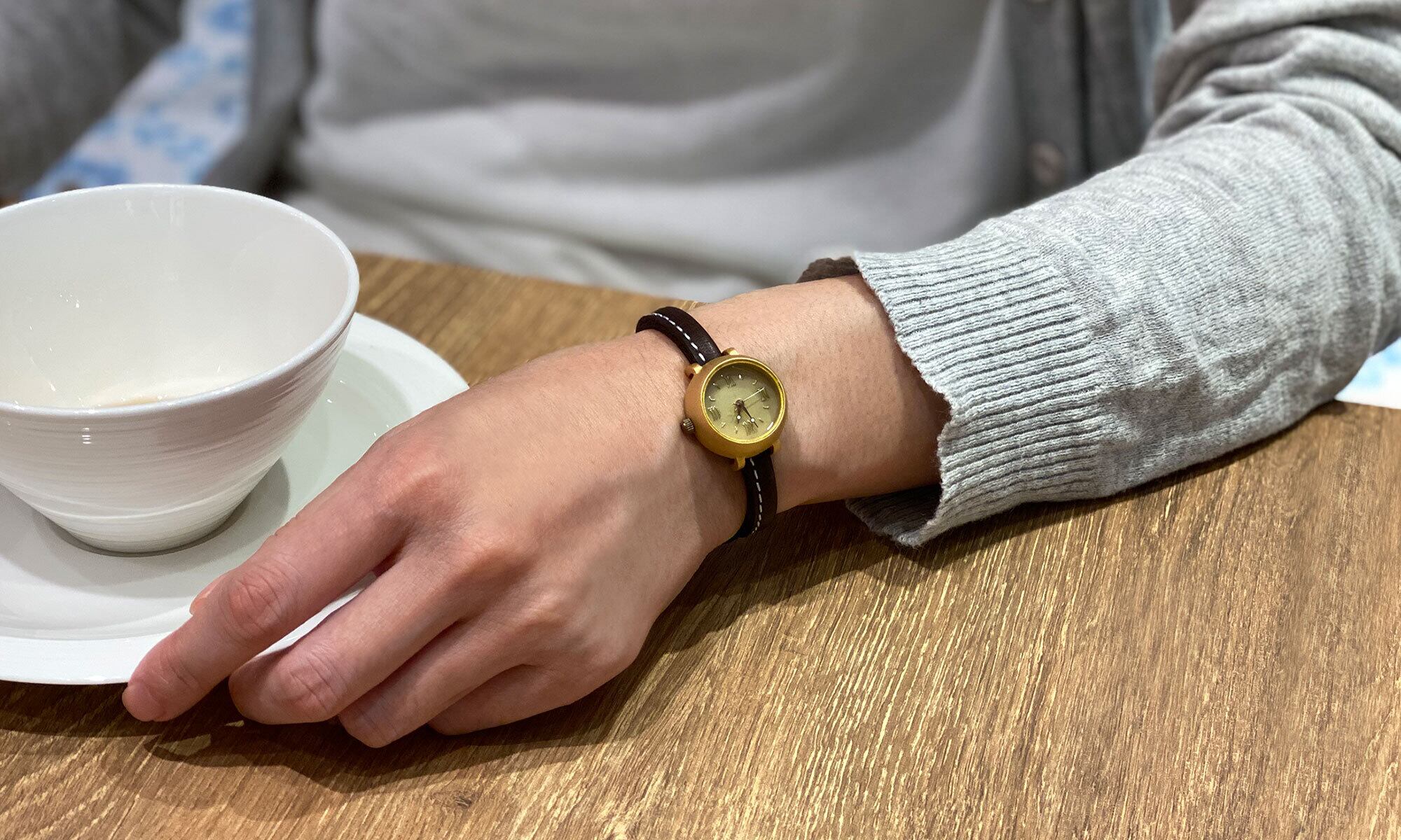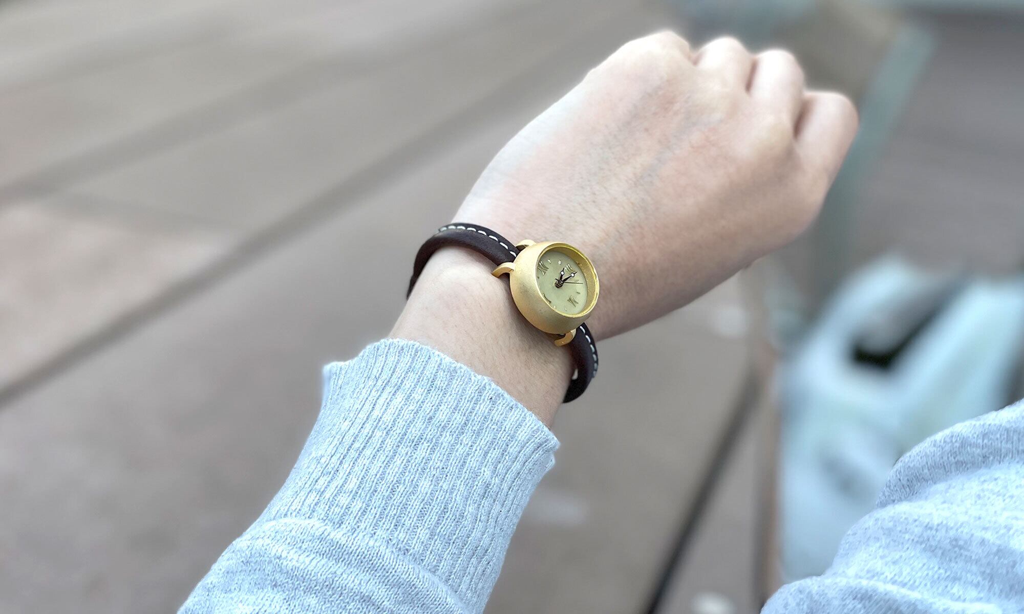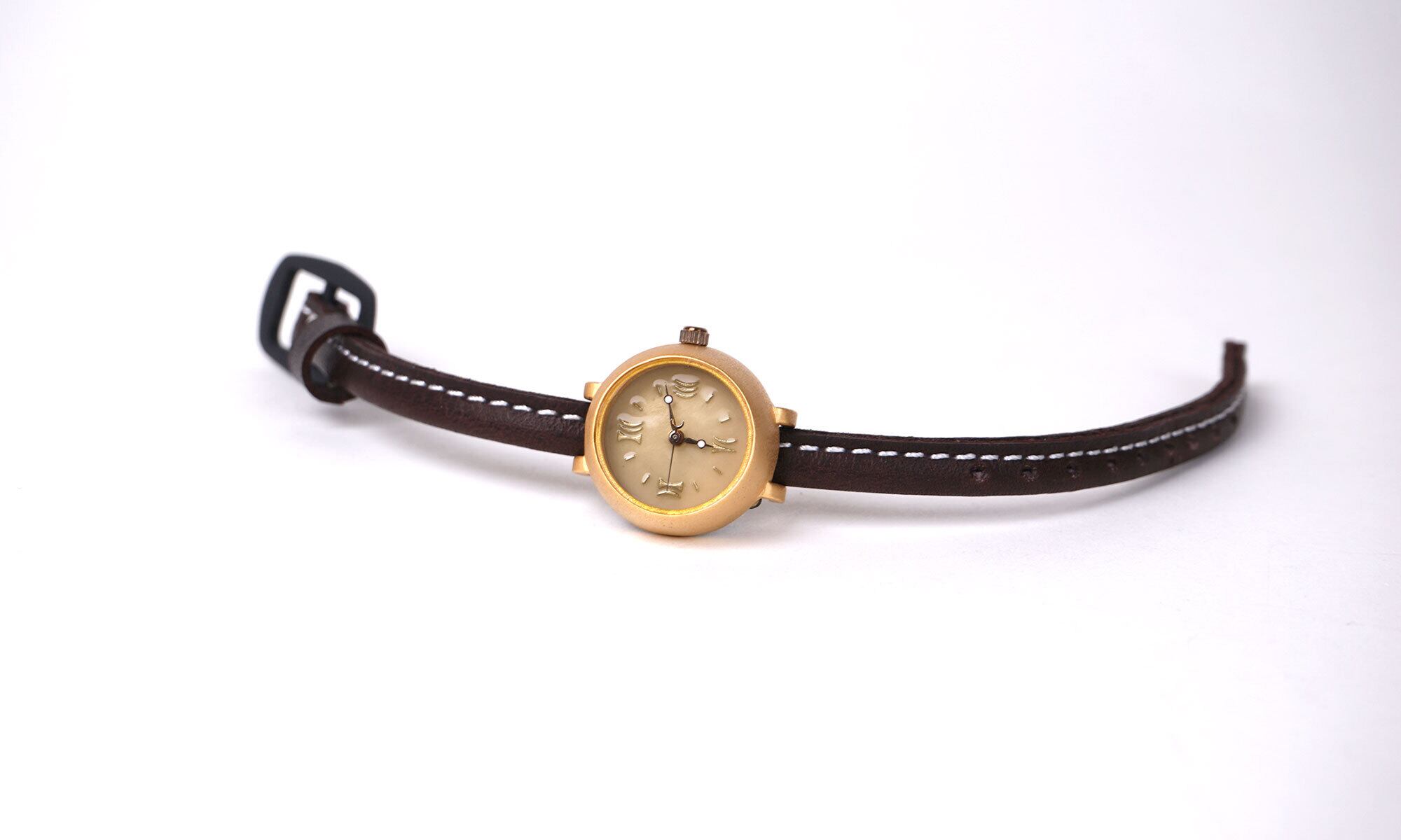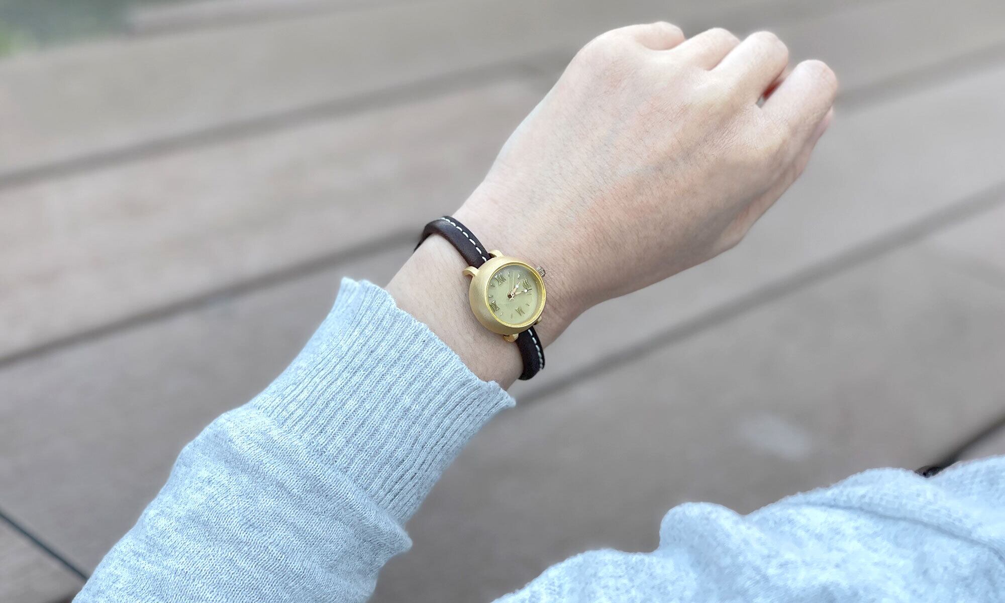 「時計本体」・・・丸窓をモチーフにした時計本体は、落ち着いたマットゴールドに仕上げています。