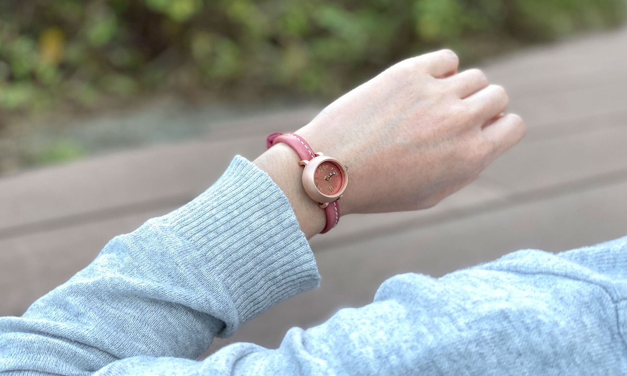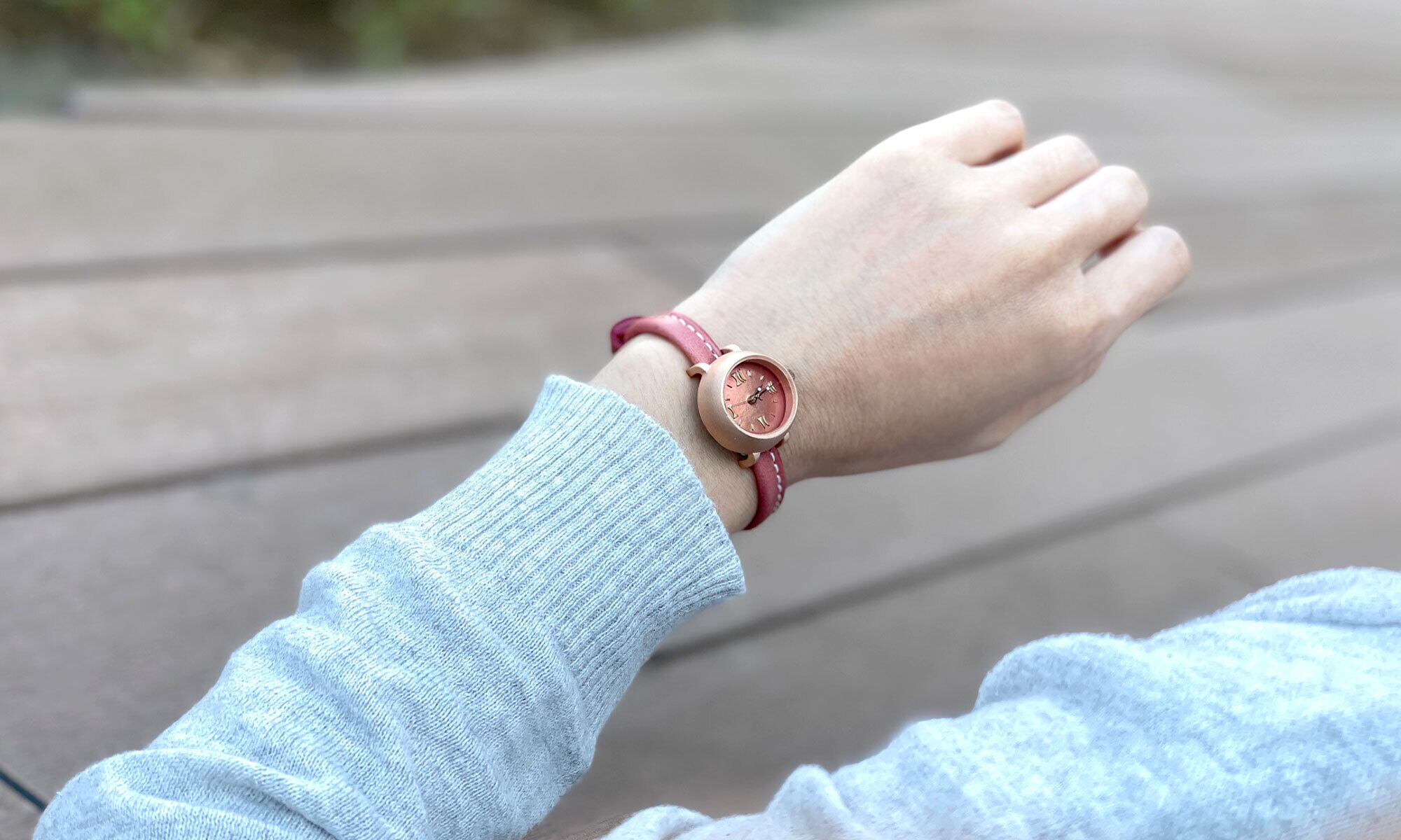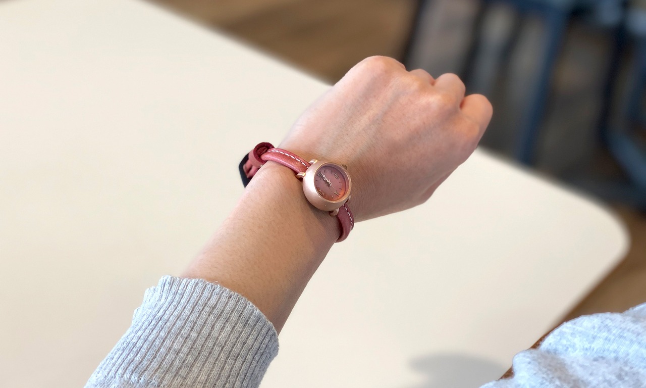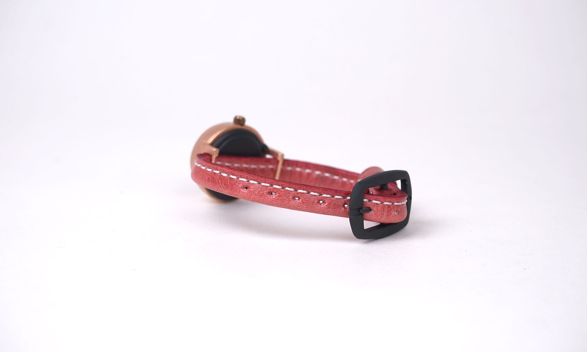 「撮影に使用したベルトの種類」・・・今回、この時計には、「プレミアピンク」の革ベルトです。