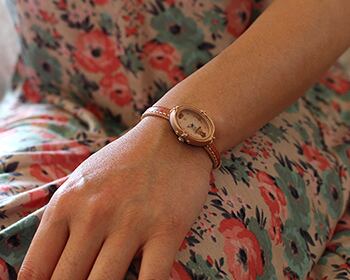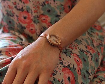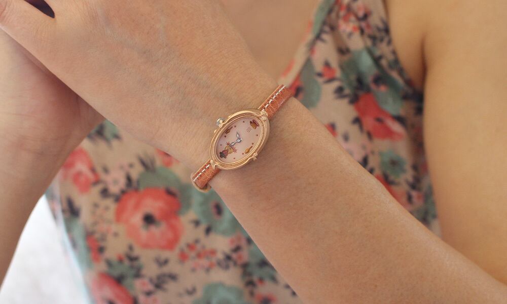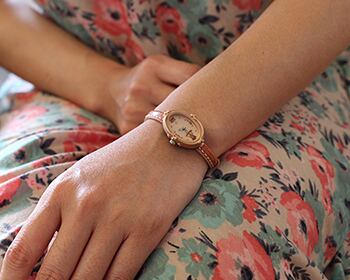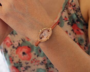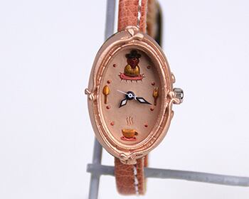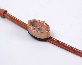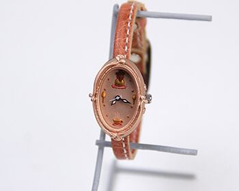 「時計本体」・・・葉とツタをかたどったプレートをイメージした楕円形の本体は、アンティーク風のカラーリングを行い、フェミニンだけども落ち着いた雰囲気に仕上げています。