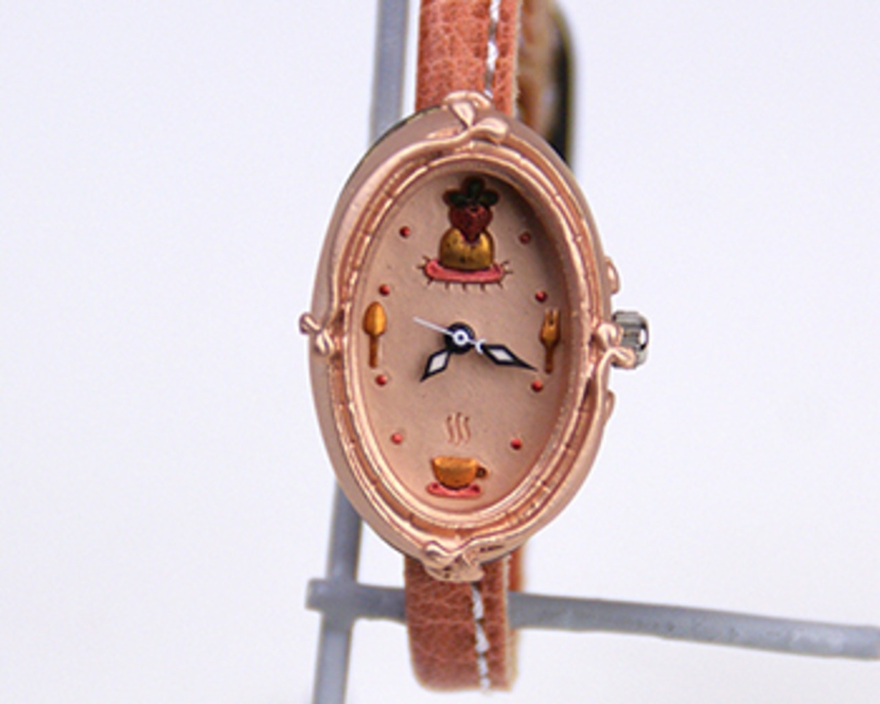 「文字盤」・・・大きなイチゴのケーキ、湯気が出ているティーカップ、スプーンとフォークがのっています。