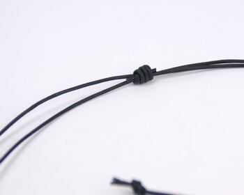 革紐全長85センチ。結び目があり、2つに折り曲げるので、40センチ位の長さになります。サイズは結び目で調節可能です。厚み15ミリ。