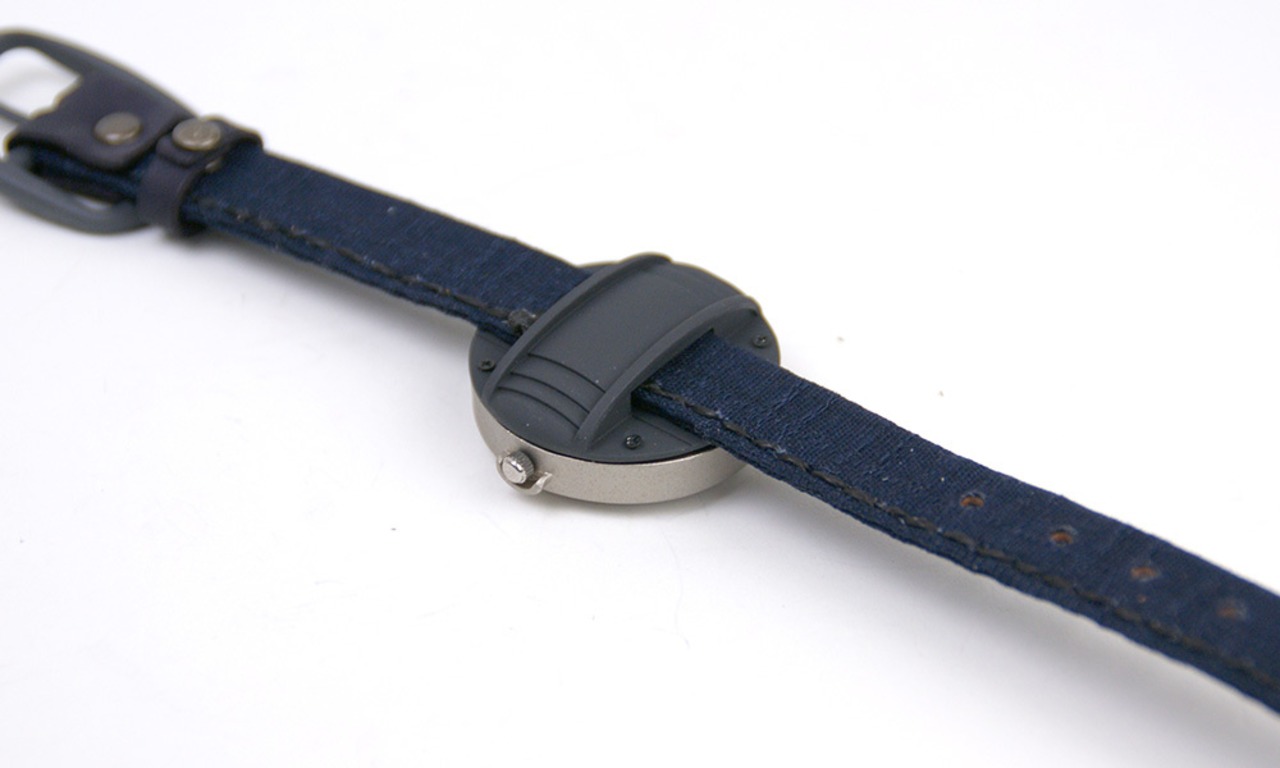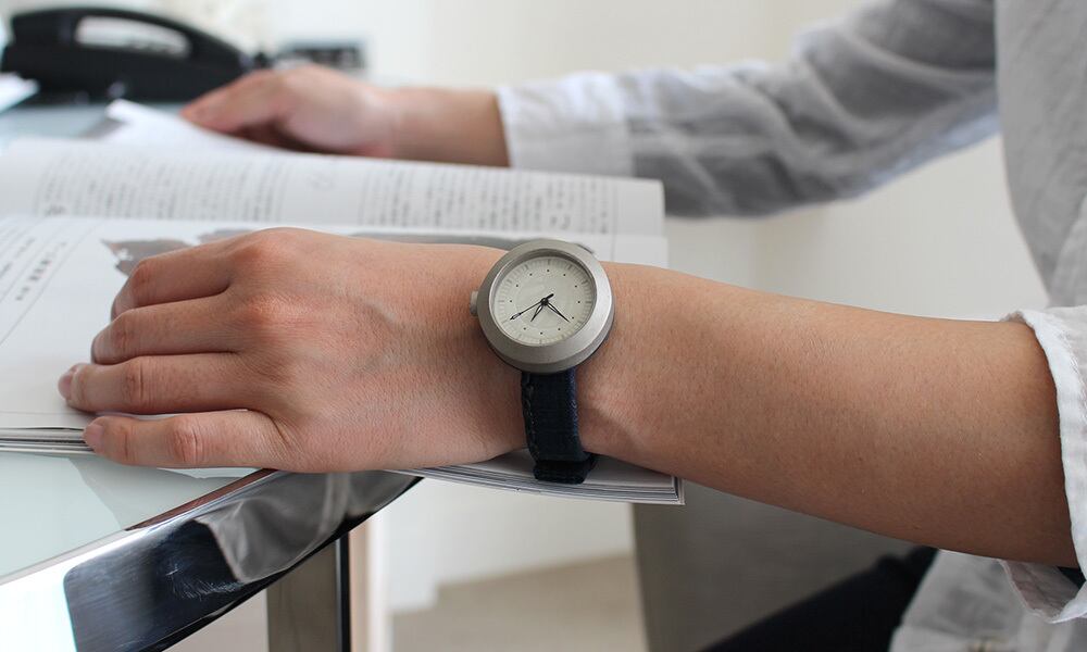 時計とベルトを繋ぐ金具が裏面に隠し、曲面をゆるやかに使用した時計本体の形状から、独特のシンとした雰囲気を醸し出しています。