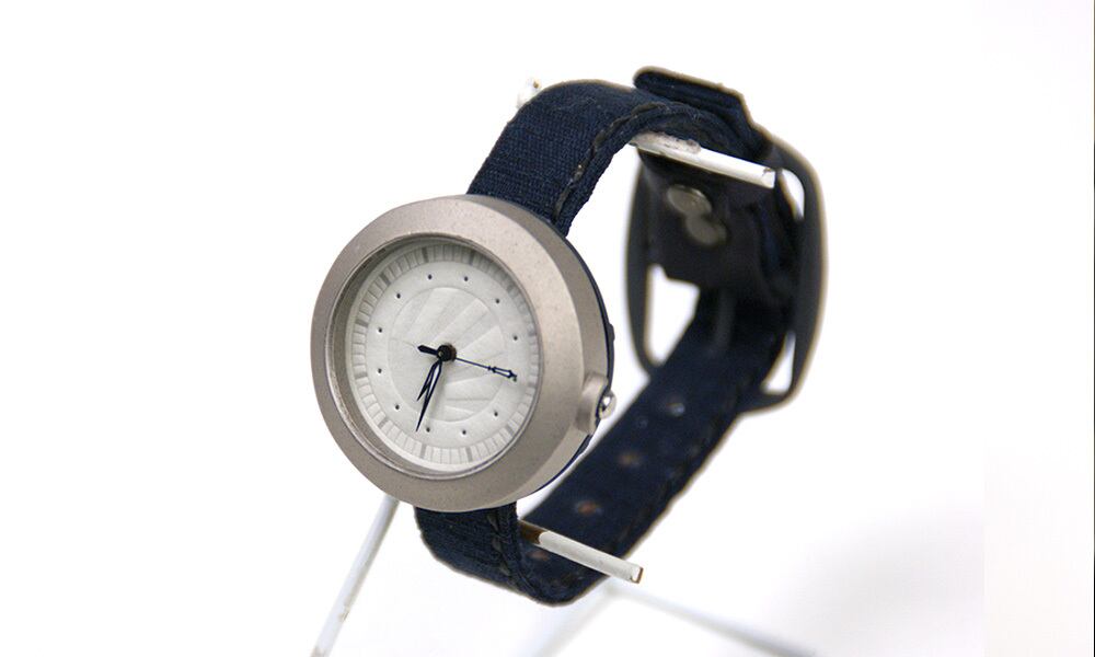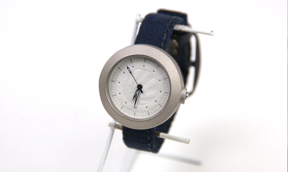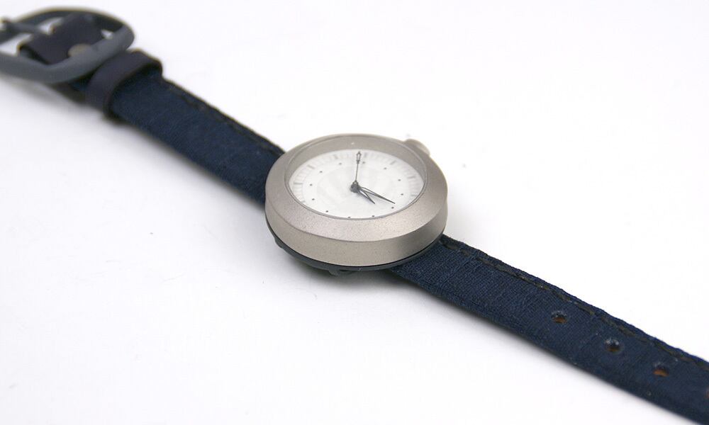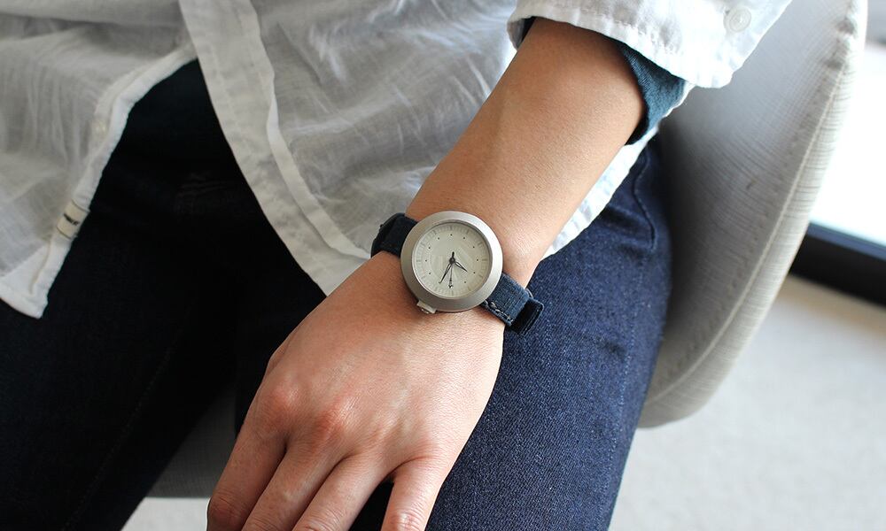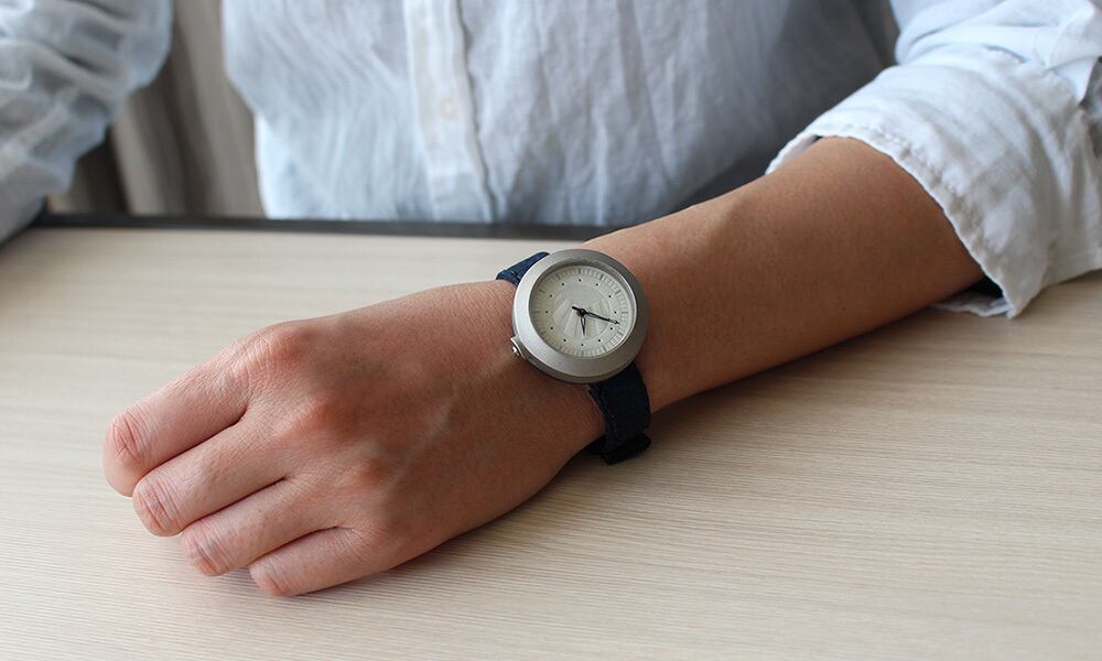 やや底に広がっていく円錐形の柔らかな印象の時計本体など、和のデザインの要素を組み合わせて作り上げた腕時計です。