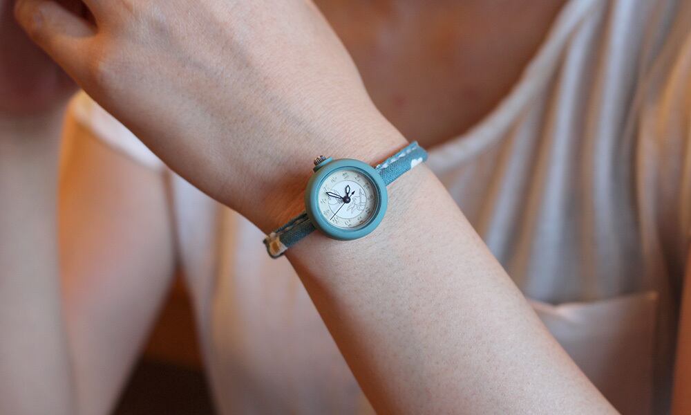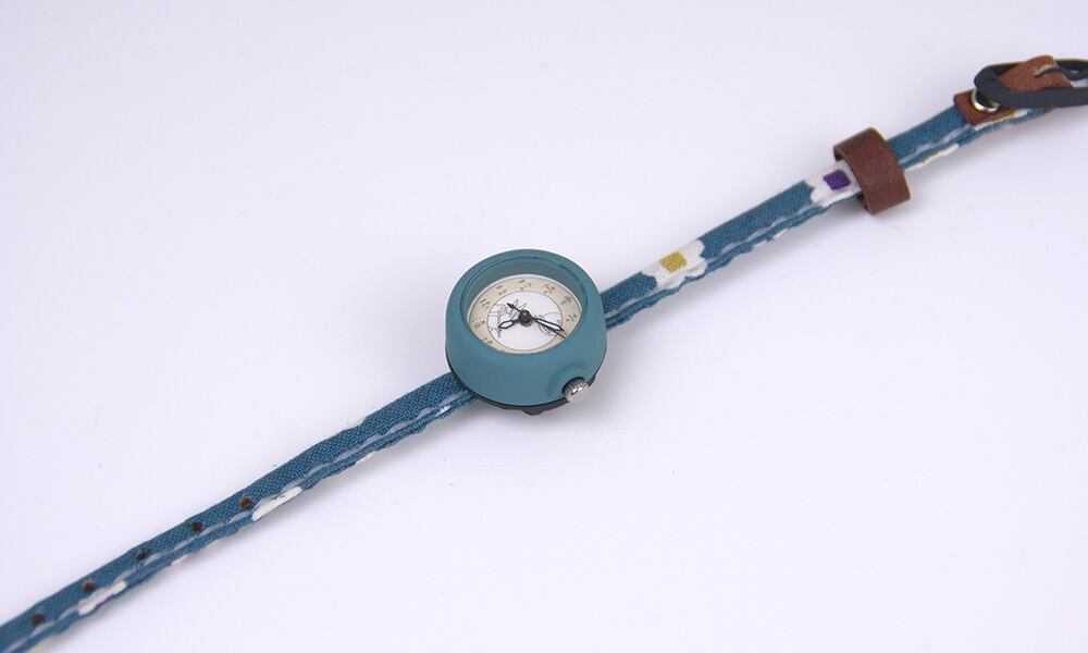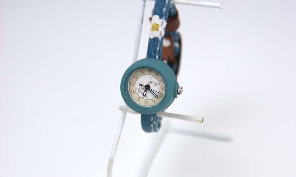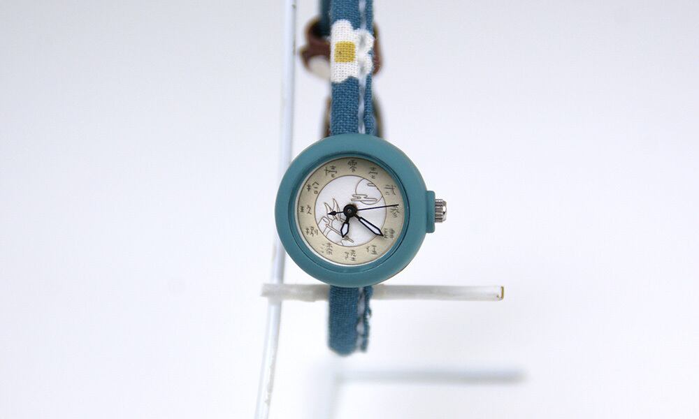 やや底に広がっていく円錐形の柔らかな印象の時計本体など、和のデザインの要素を組み合わせて作り上げた、小さな腕時計です。