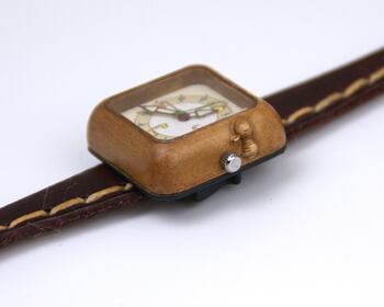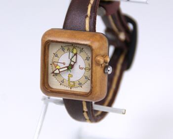 長い時を経て擬人化した道具たちがいっぱいの腕時計は、あたたかみのあるカラーとデザイン、どこか懐かしい手縫いのベルトが特徴です。