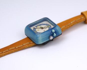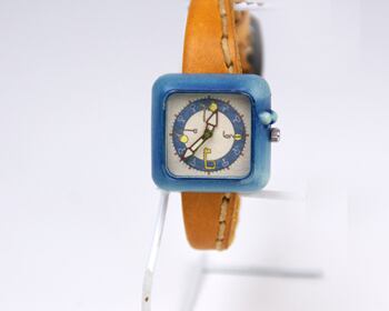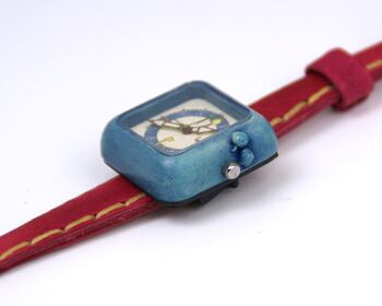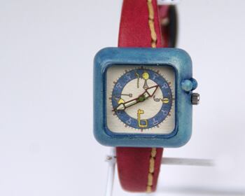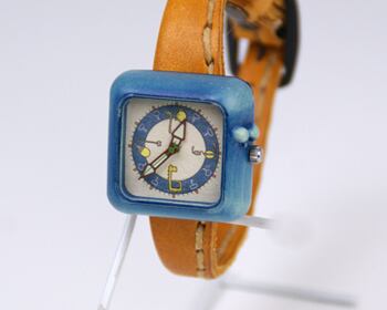 長い時を経て擬人化した道具たちがいっぱいの腕時計は、あたたかみのあるカラーとデザイン、どこか懐かしい手縫いのベルトが特徴です。