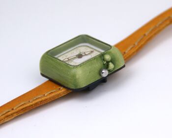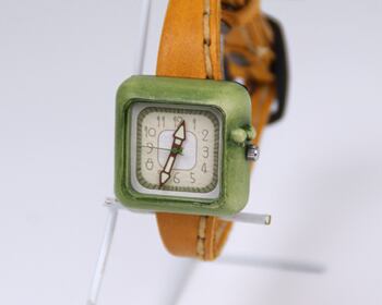 長い時を経て擬人化した道具たちがいっぱいの腕時計は、あたたかみのあるカラーとデザイン、どこか懐かしい手縫いのベルトが特徴です。