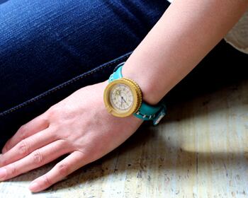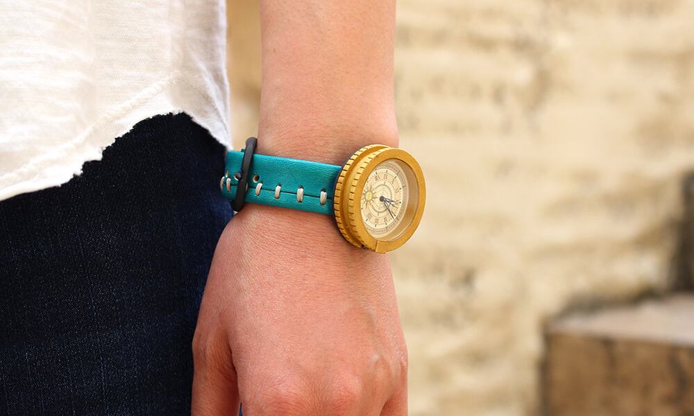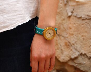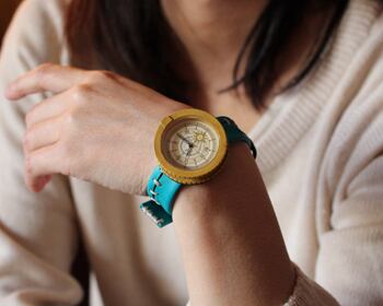 穏やかな美しいムラのあるイエローに仕上げた特徴のある時計本体には、少し立体感を出した美しい文字盤を合わせています。