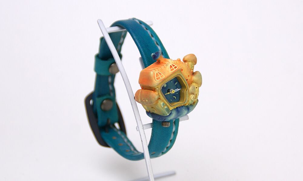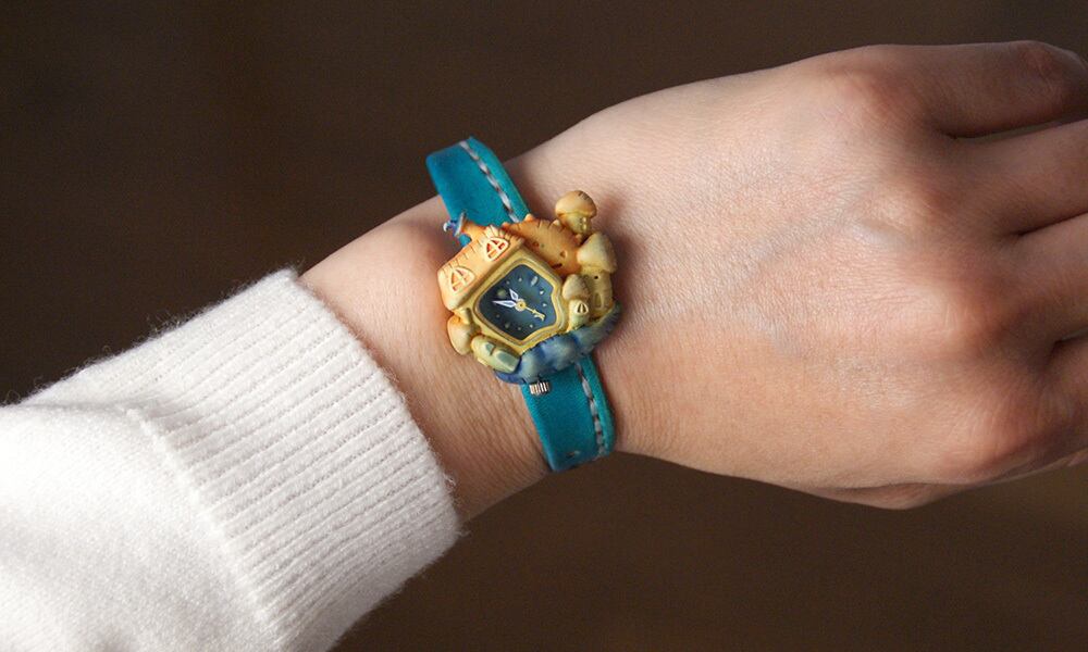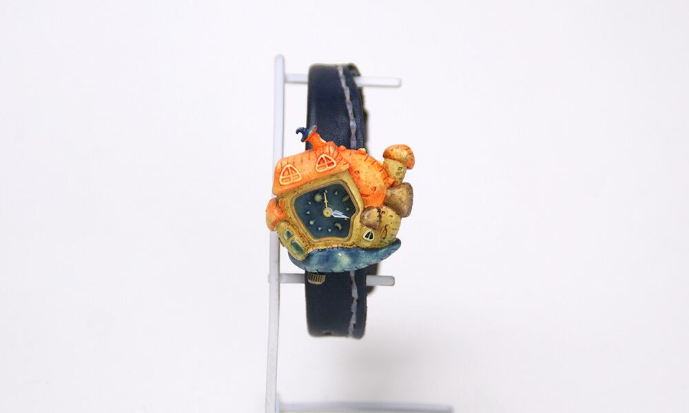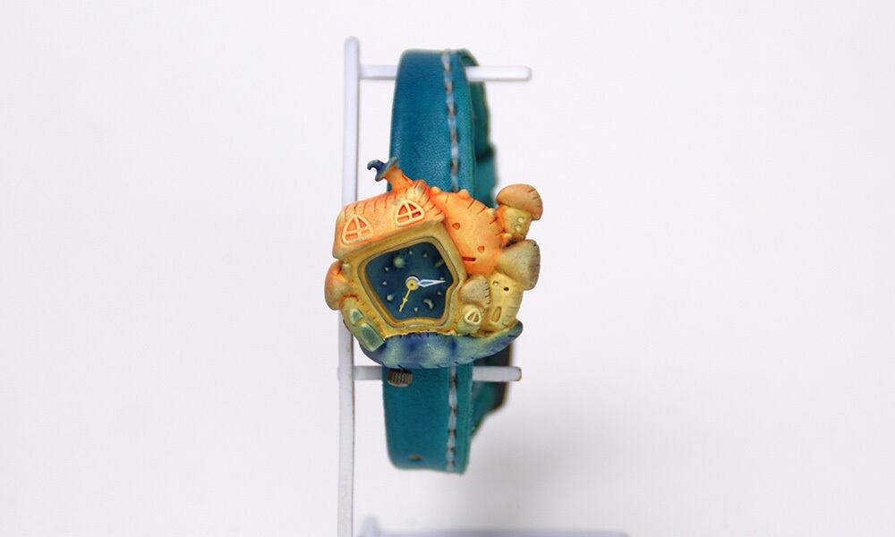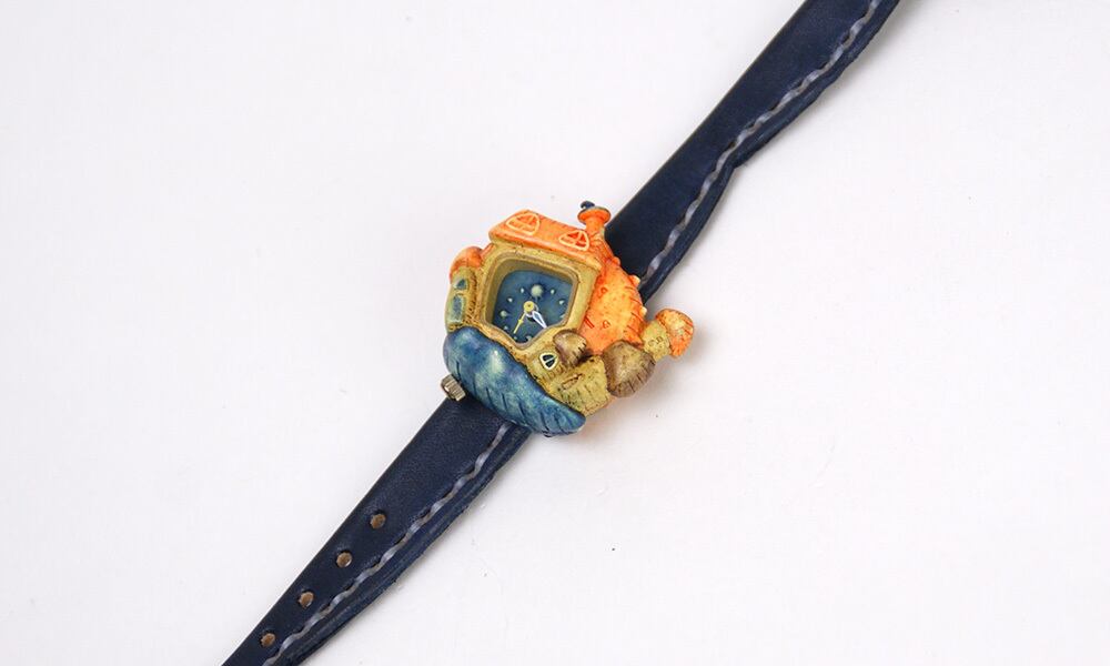 「裏蓋」・・・裏側から見ても、家が雲に乗っています。そこからベルトを通していますので、ベルトの着せ替えができます。