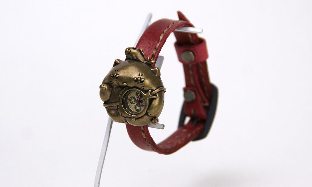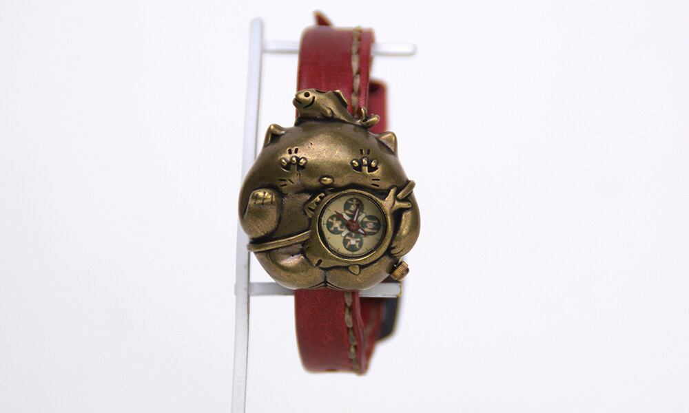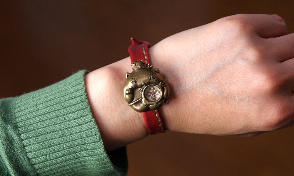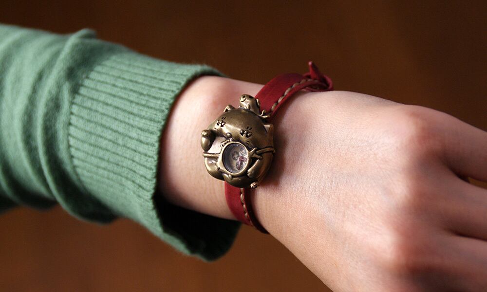 その太った体に持ちきれないほど色々なモノを持ち、招き猫の中でもかなり凄腕ということが一目瞭然なこの招き猫を腕につけるとこんな感じです。