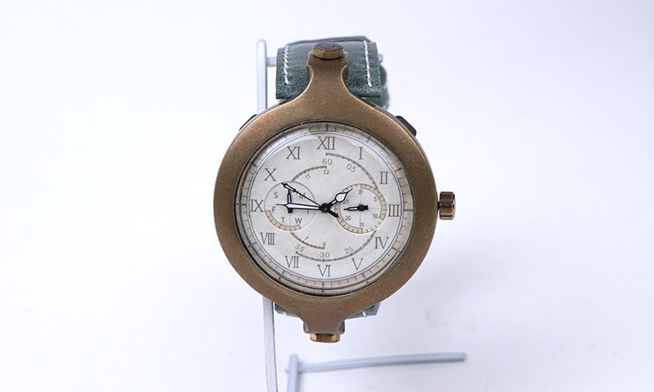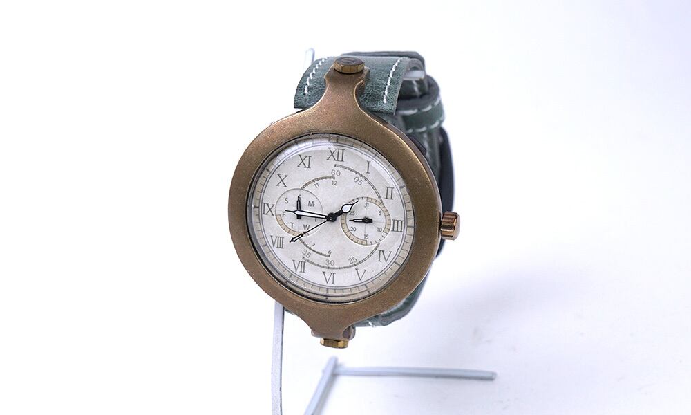 「時計本体」・・・Pairoの大きめで薄いケースはそのままに、レトロなカラーリングを行いました。この時計は、時代を経たような「アンティーク」に仕上げています。