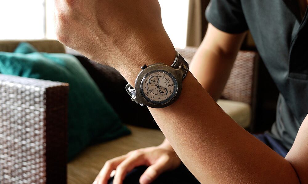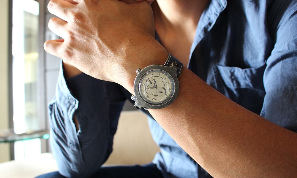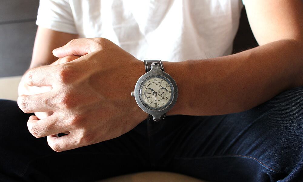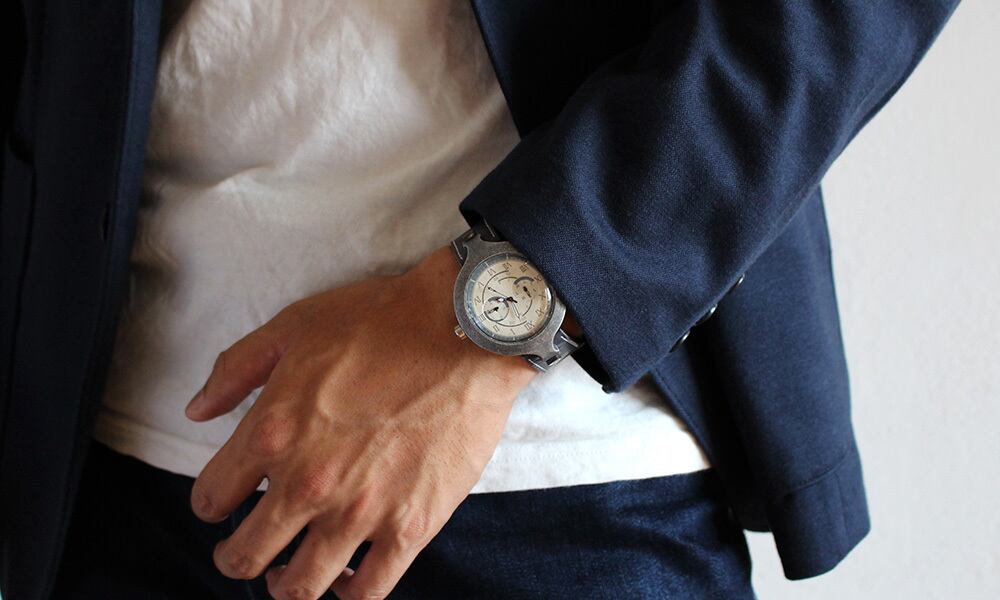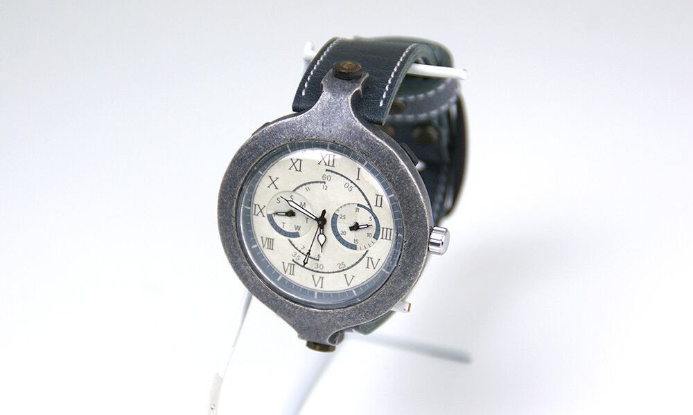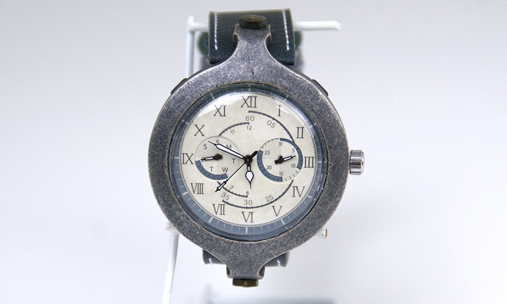 飛行機の計器のような、アナログ針での曜日や日付表示がついたマルチな機能はそのままに、スマートに進化した「Pairo」は、その個性的ながらスタイリッシュな雰囲気に、少しハンドメイド感を残した外見で、お仕事でも、カジュアルでも、どんなシーンでも使えると人気の時計です。