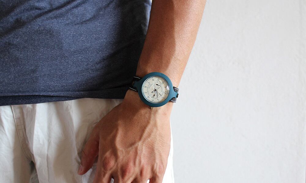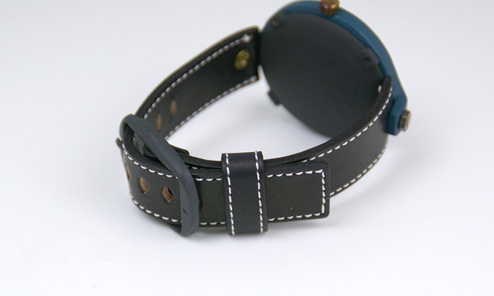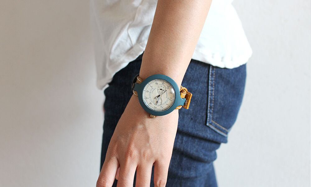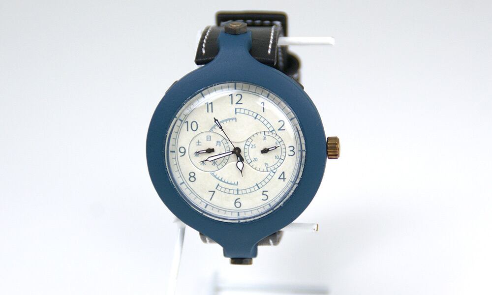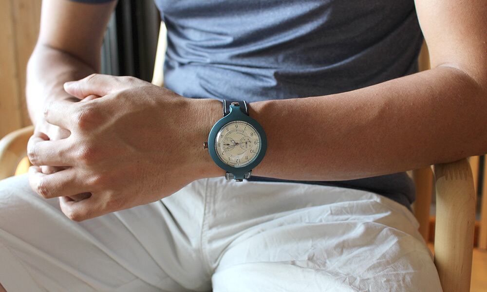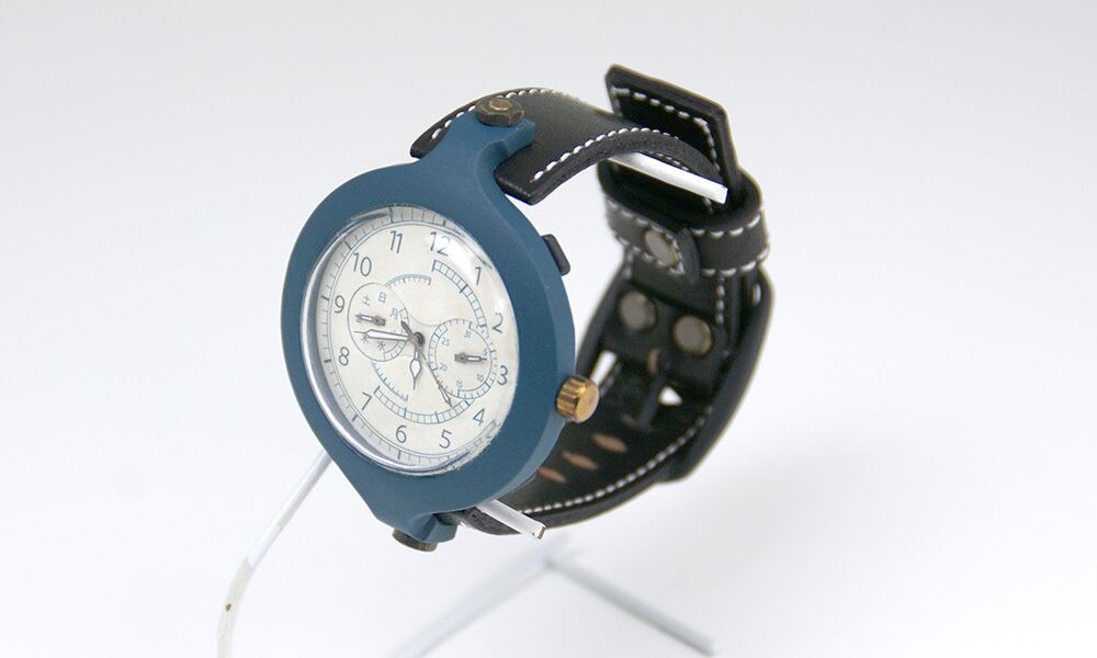 「時計本体」・・・Pairoの大きく薄い腕時計のケース(本体)はそのままに、レトロなカラーに仕上げています。この時計は光沢を抑えた「レトロブルー」に仕上げました。