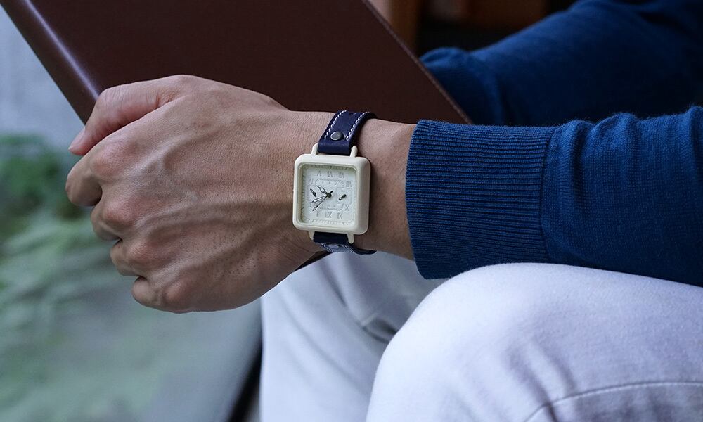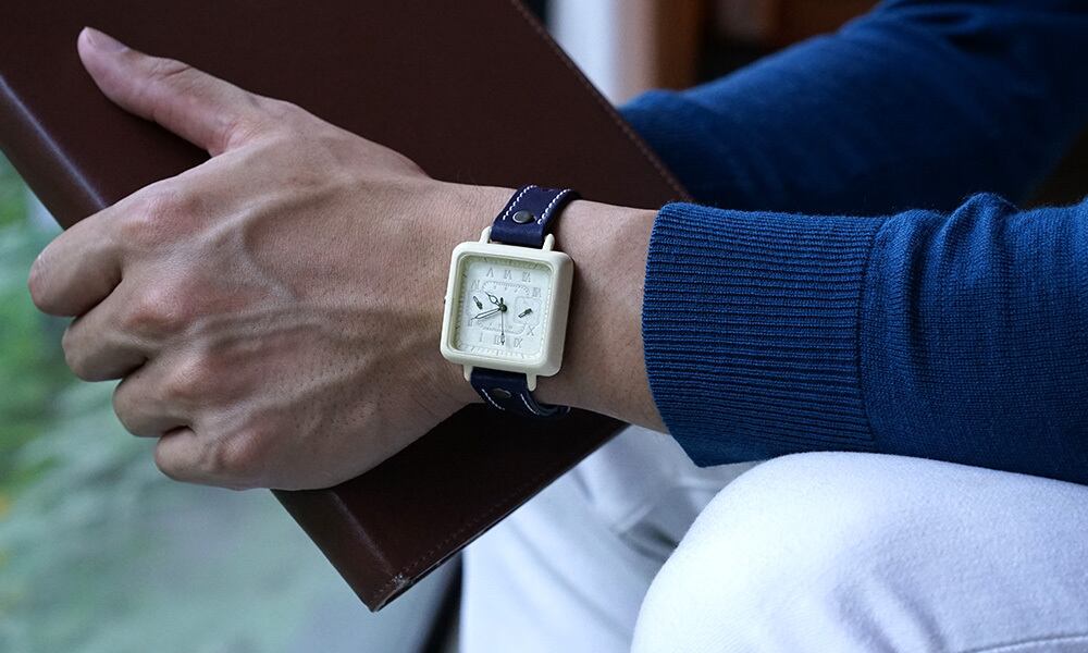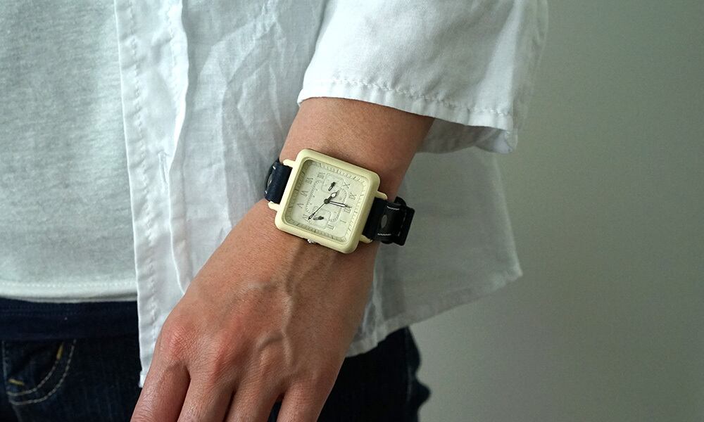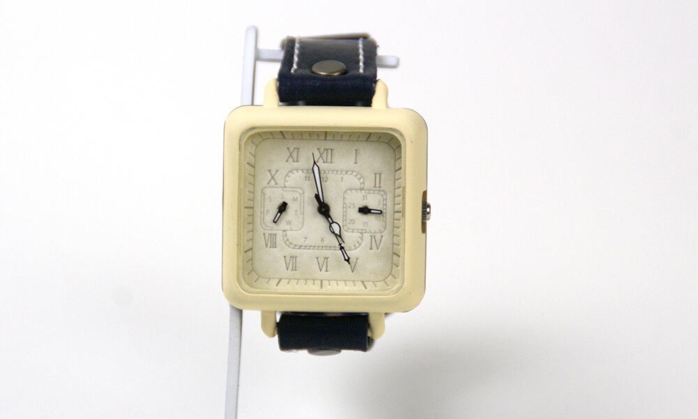 「時計本体」・・・正方形の角丸デザインです。男性でも女性でもつけられる大きさとなっています。
