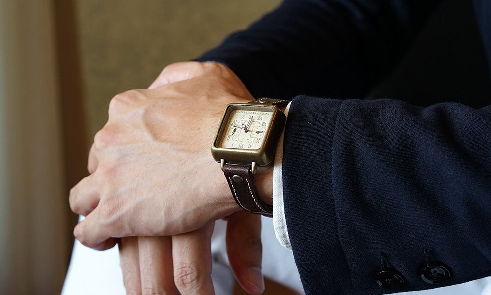 「時計本体」・・・正方形の角丸デザインです。男性でも女性でもつけられる大きさとなっています。