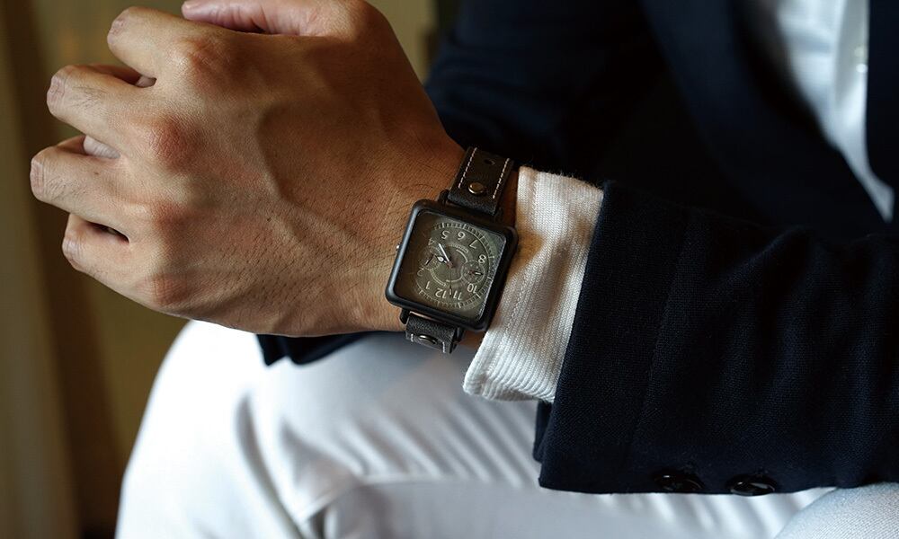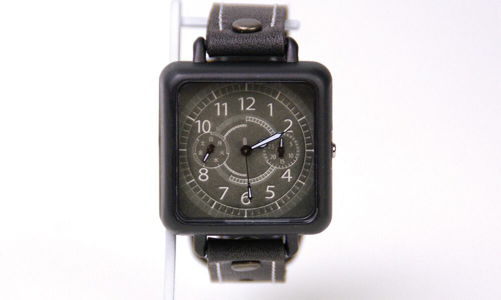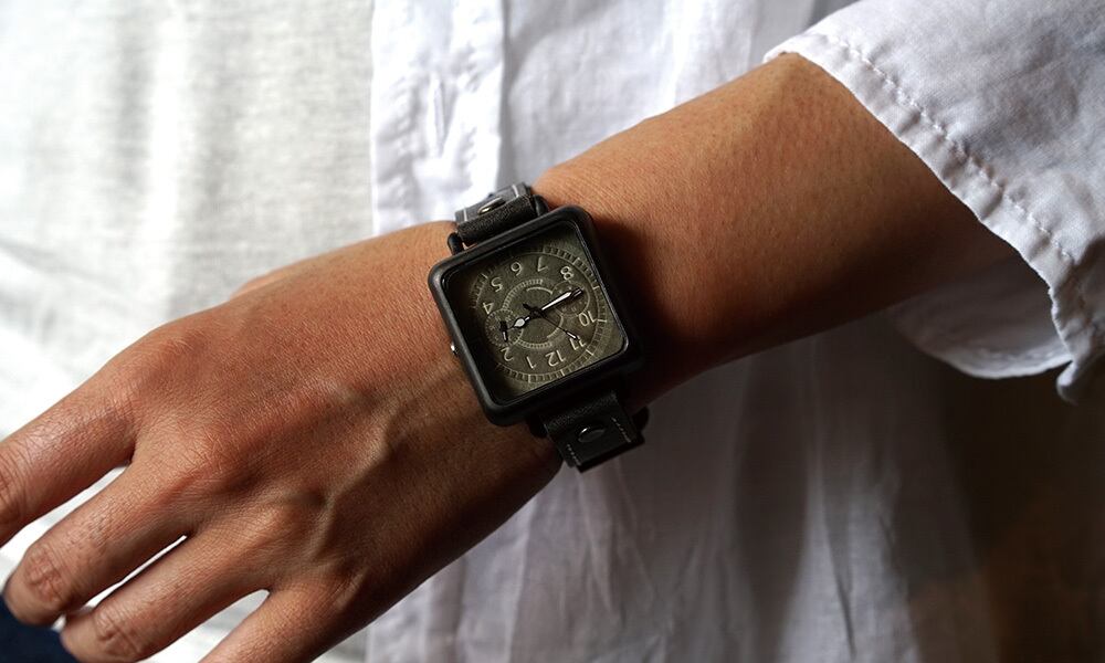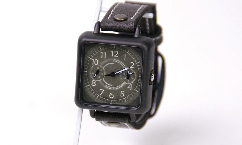 「時計加工」・・・メタリックなブラックに仕上げています。光沢を抑え、大人な印象にし、グッと締まったクールな腕時計です。