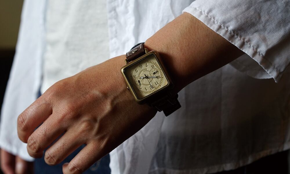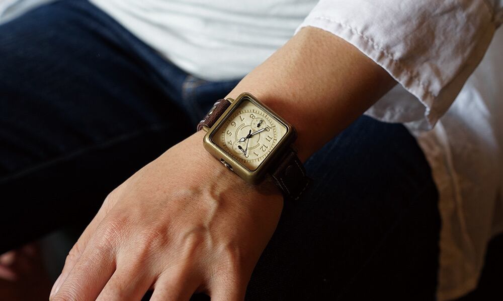 「時計本体」・・・正方形の角丸デザインです。男性でも女性でもつけられる大きさとなっています。