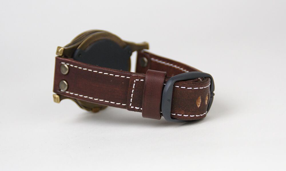 「厚めの本革ベルト」・・・本革を使用したベルトは、重厚な本体に負けない厚めに切り出した革を手塗りし、2重にして縫い合わせた「両面銀面(革のツルツルした面)」の高級仕様。