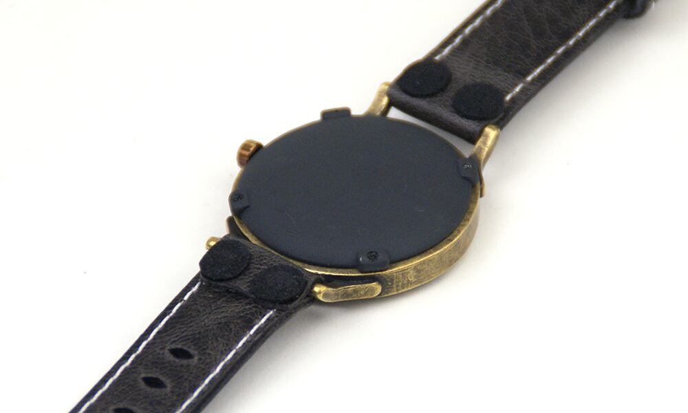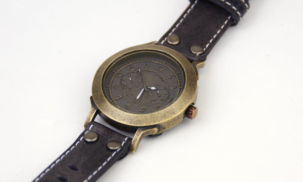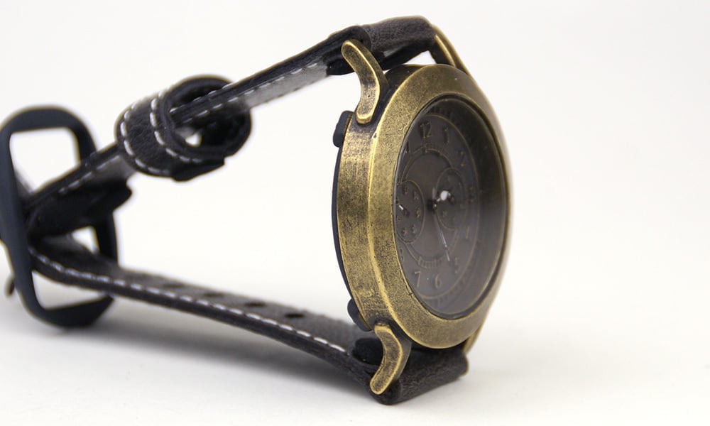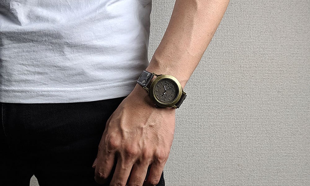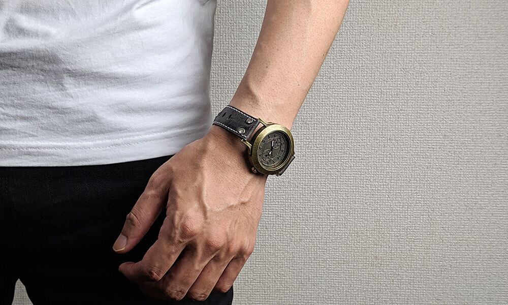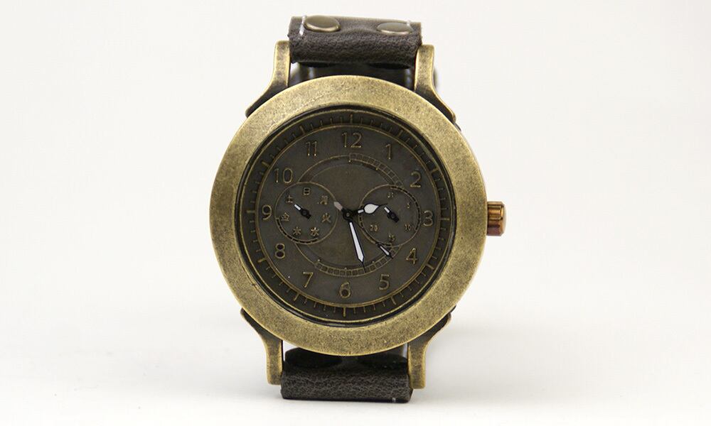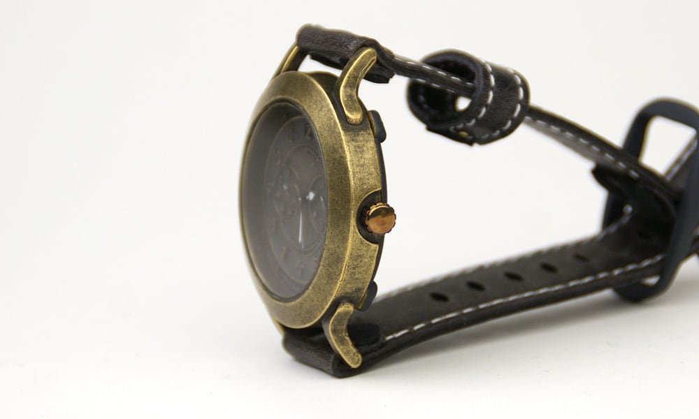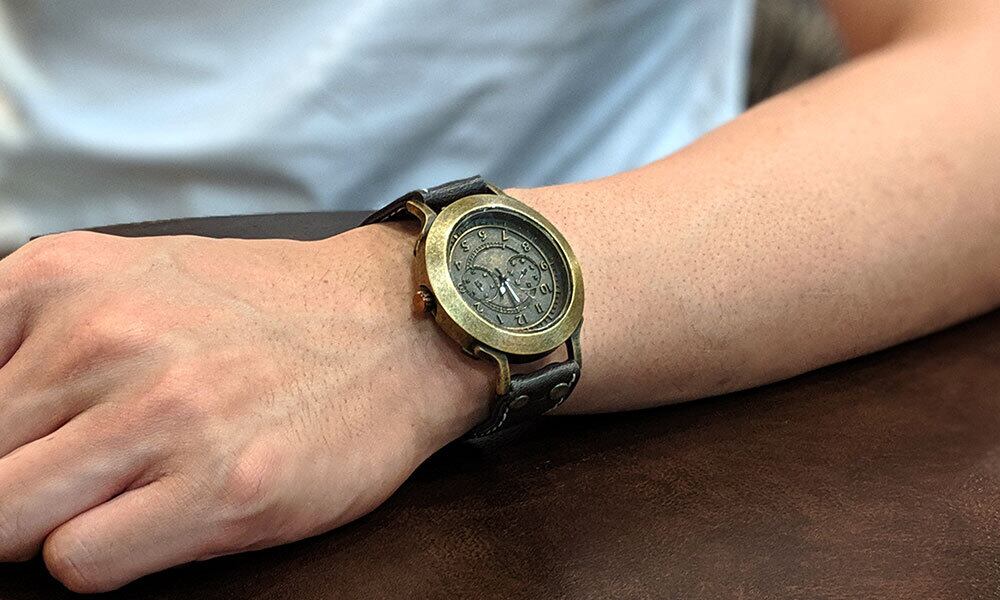 デザインはなるべくベーシックでシンプルにしながら、日本語での曜日表示などの工夫を散りばめたスリーアイの時計で、本体文字盤すべてを金属で制作し、アンティーク風に仕上げました。
