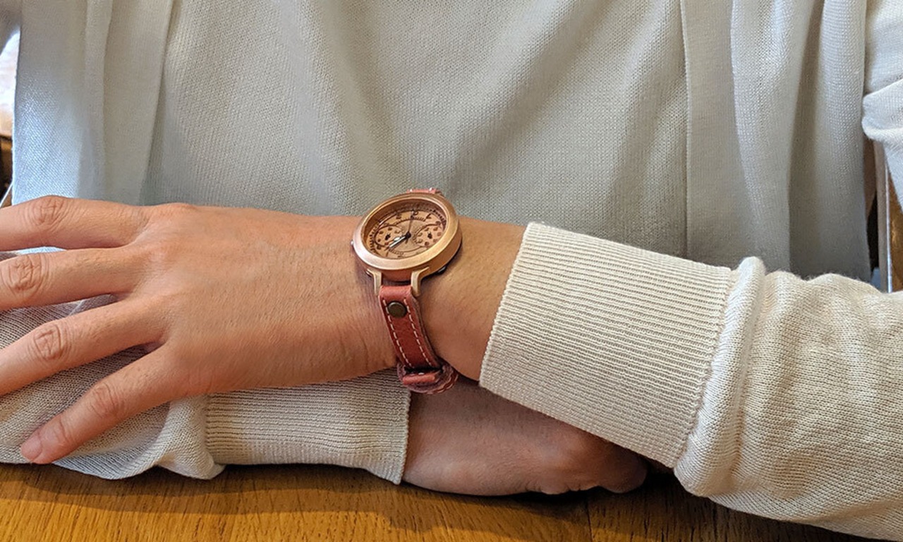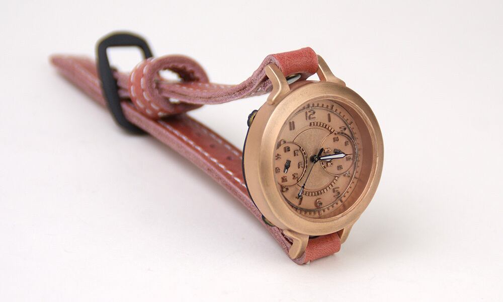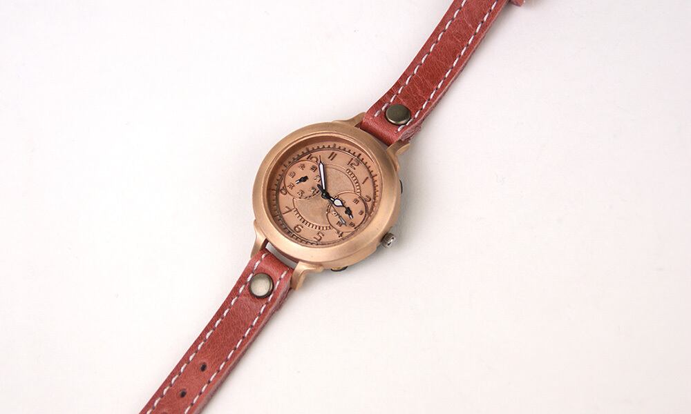 デザインはなるべくベーシックでシンプルにしながら、日本語での曜日表示などの工夫をちりばめたスリーアイの時計を、本体文字盤すべてを金属で制作し、アンティーク風に仕上げました。