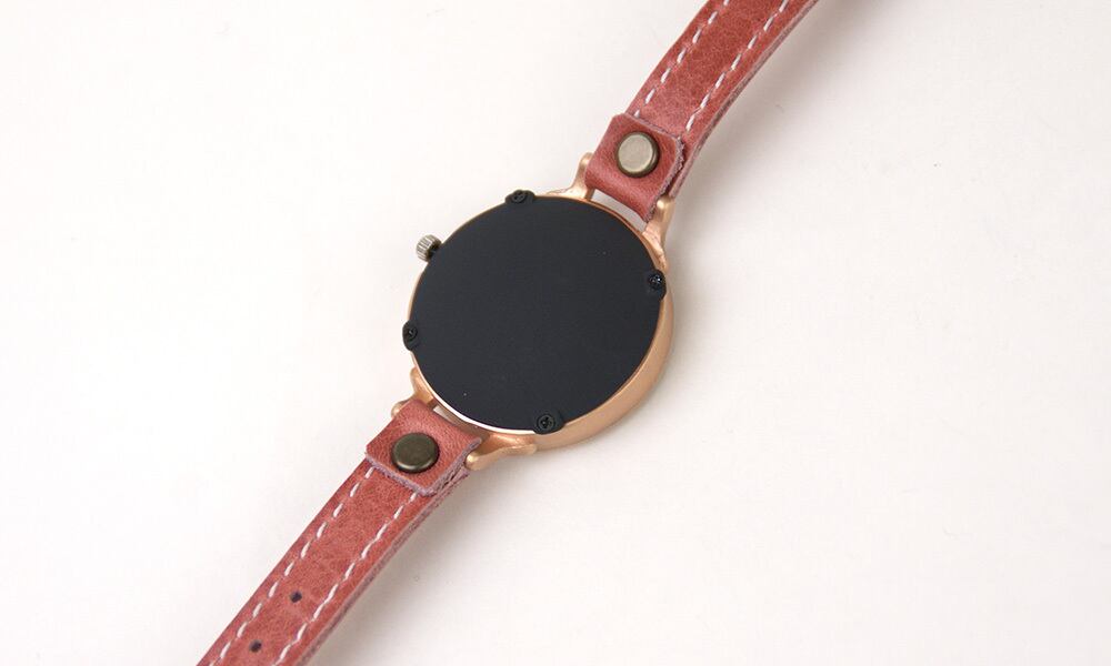 「裏蓋」・・・裏蓋は、金属で制作したあと、腕に直接多く触れる箇所なので、塗装を施しています。色は消墨色で日本の伝統色で仕上げました。
