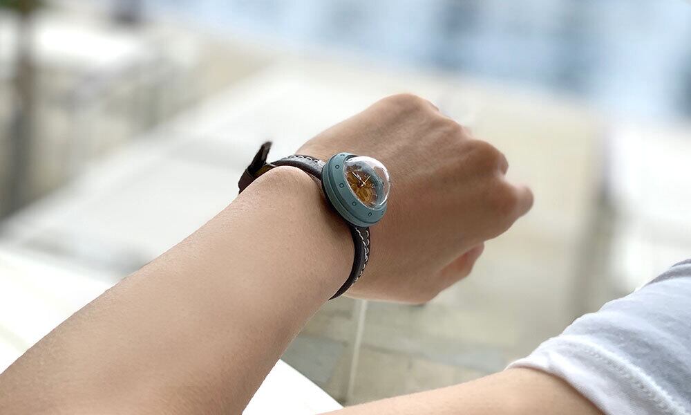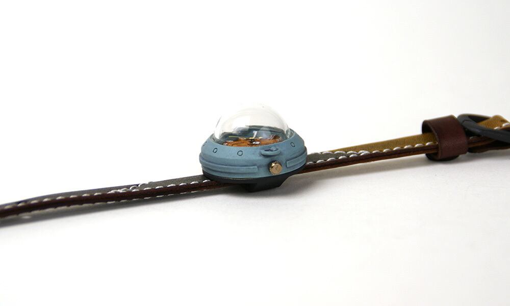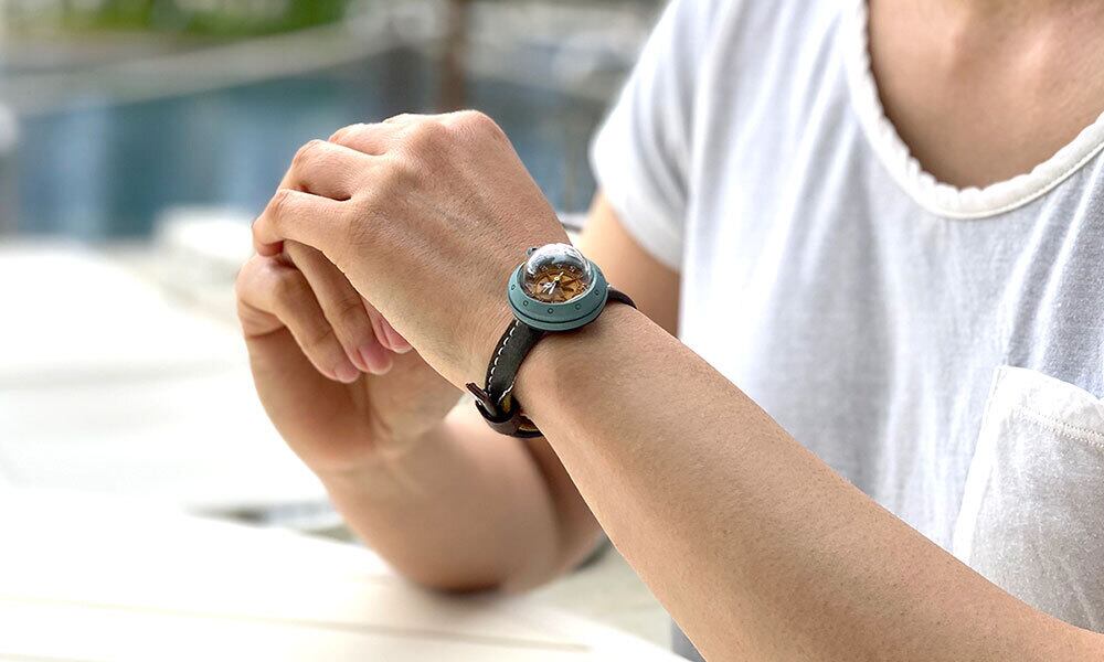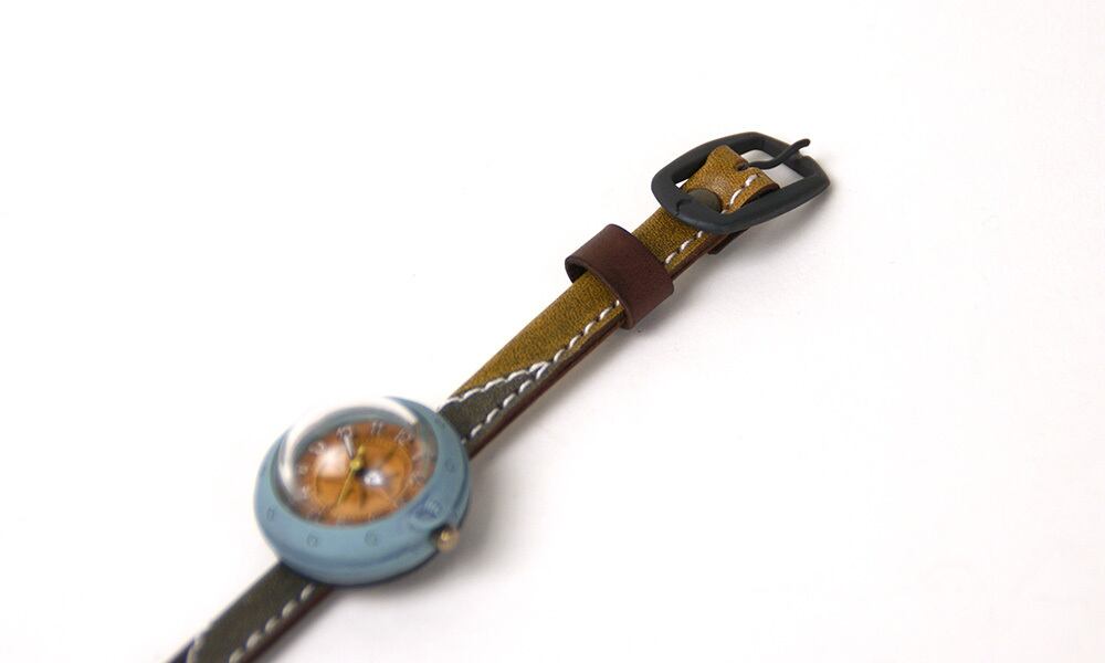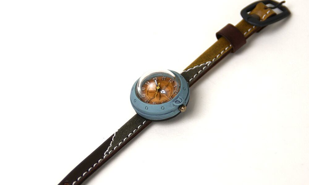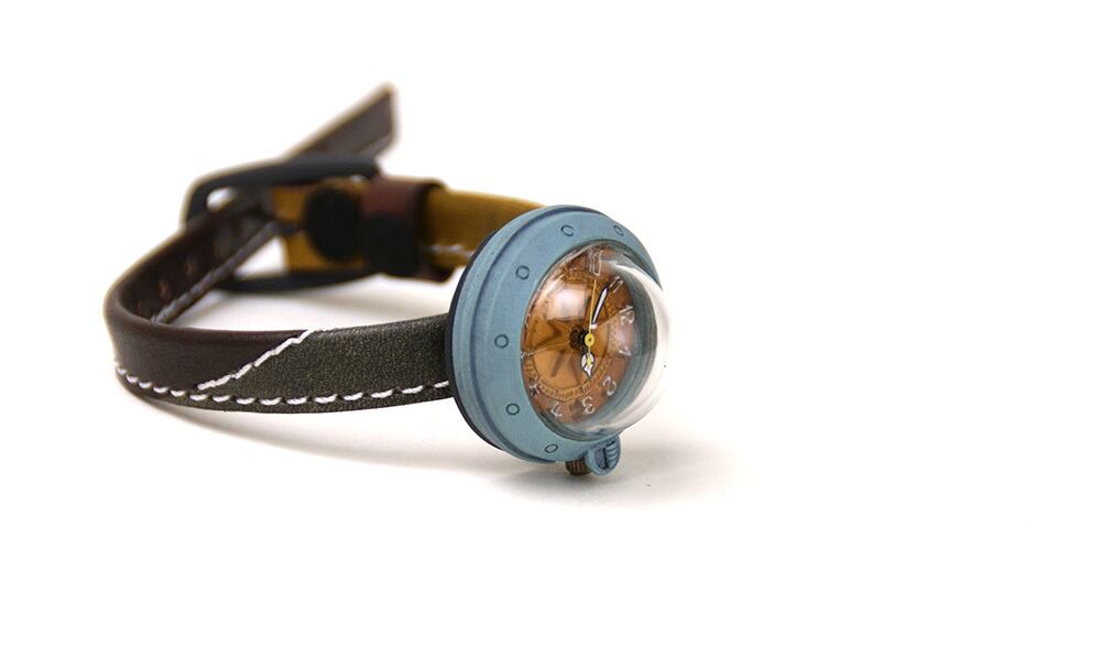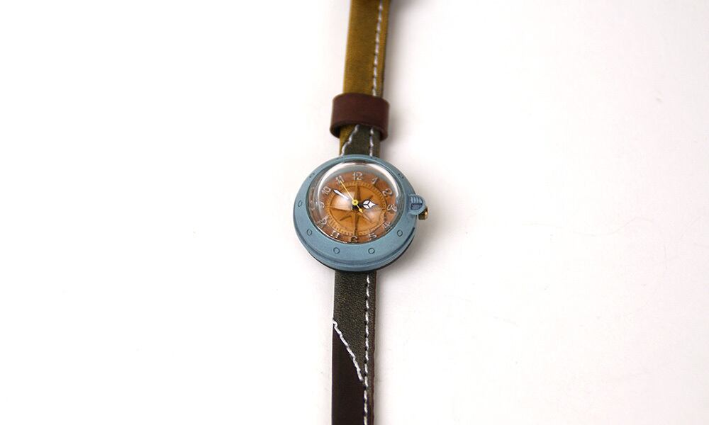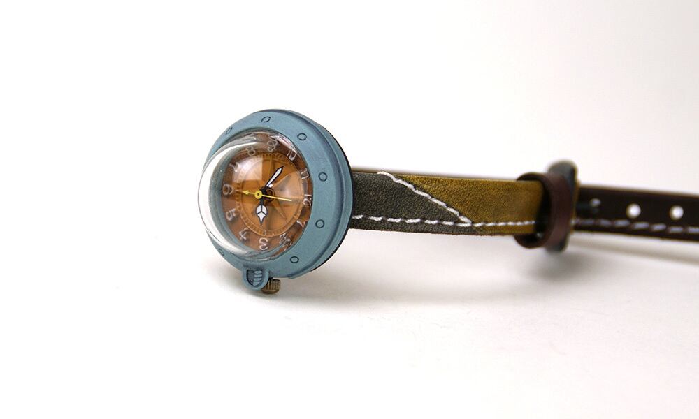 「時計本体」・・・船をイメージした時計本体には、船室の窓をイメージした半球型のレンズがついています。