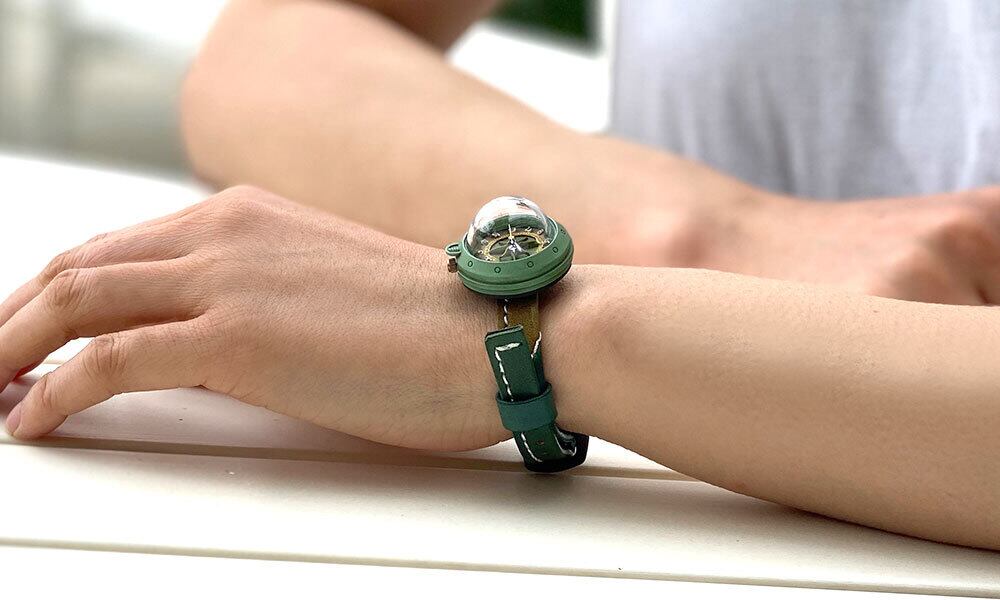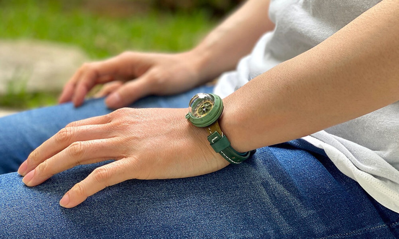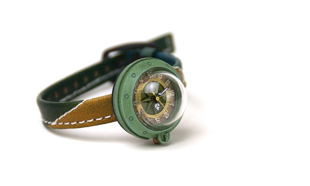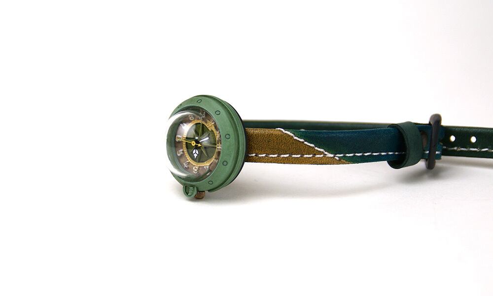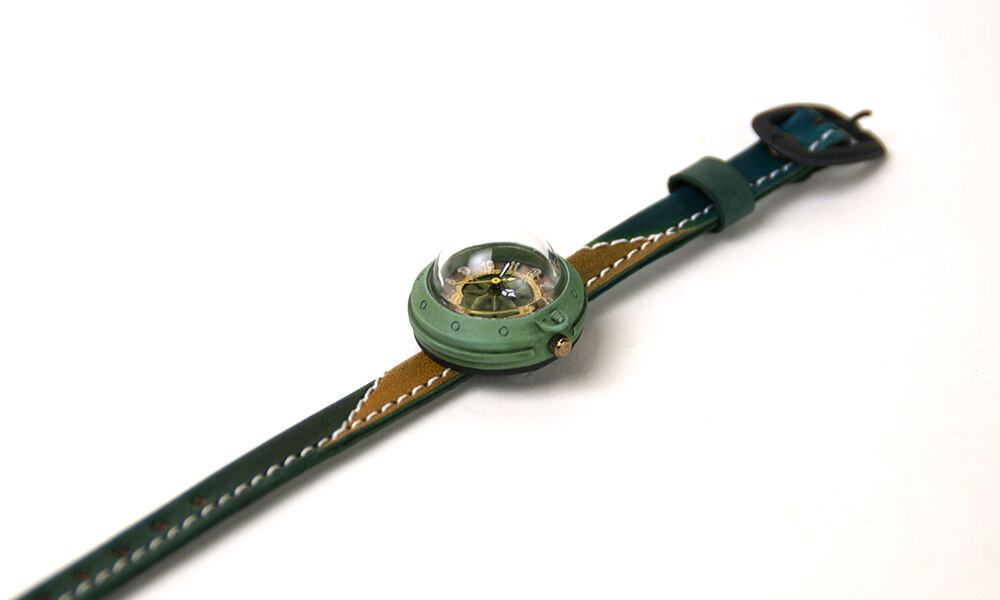 「時計本体」・・・船をイメージした時計本体には、船室の窓をイメージした半球型のレンズがついています。