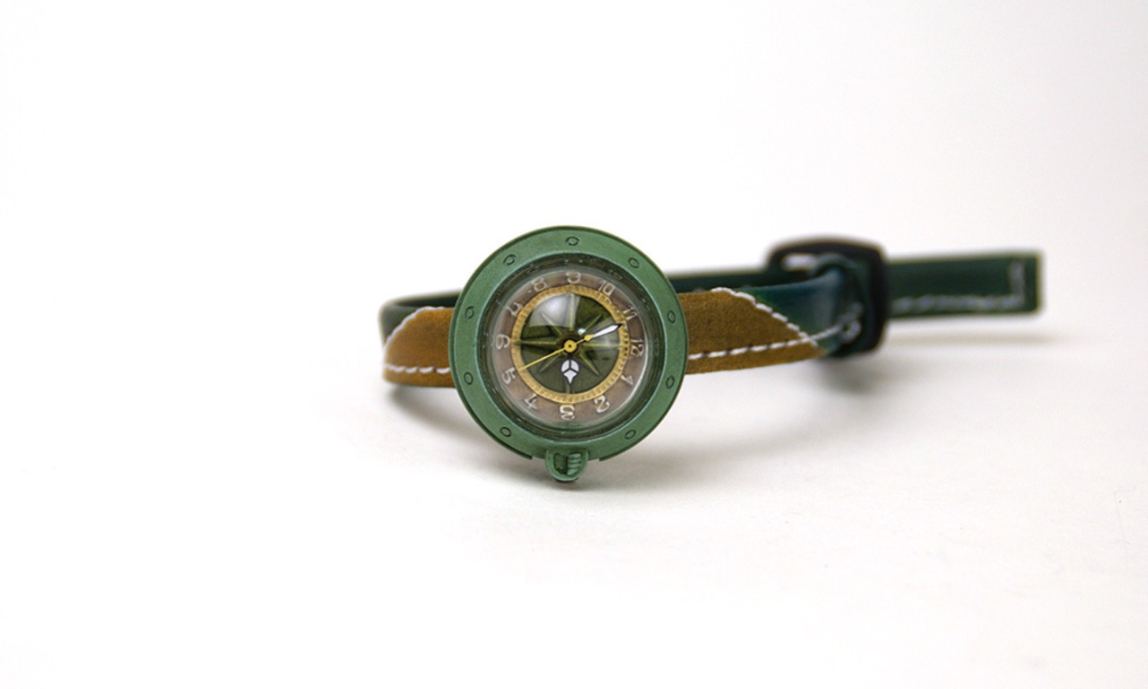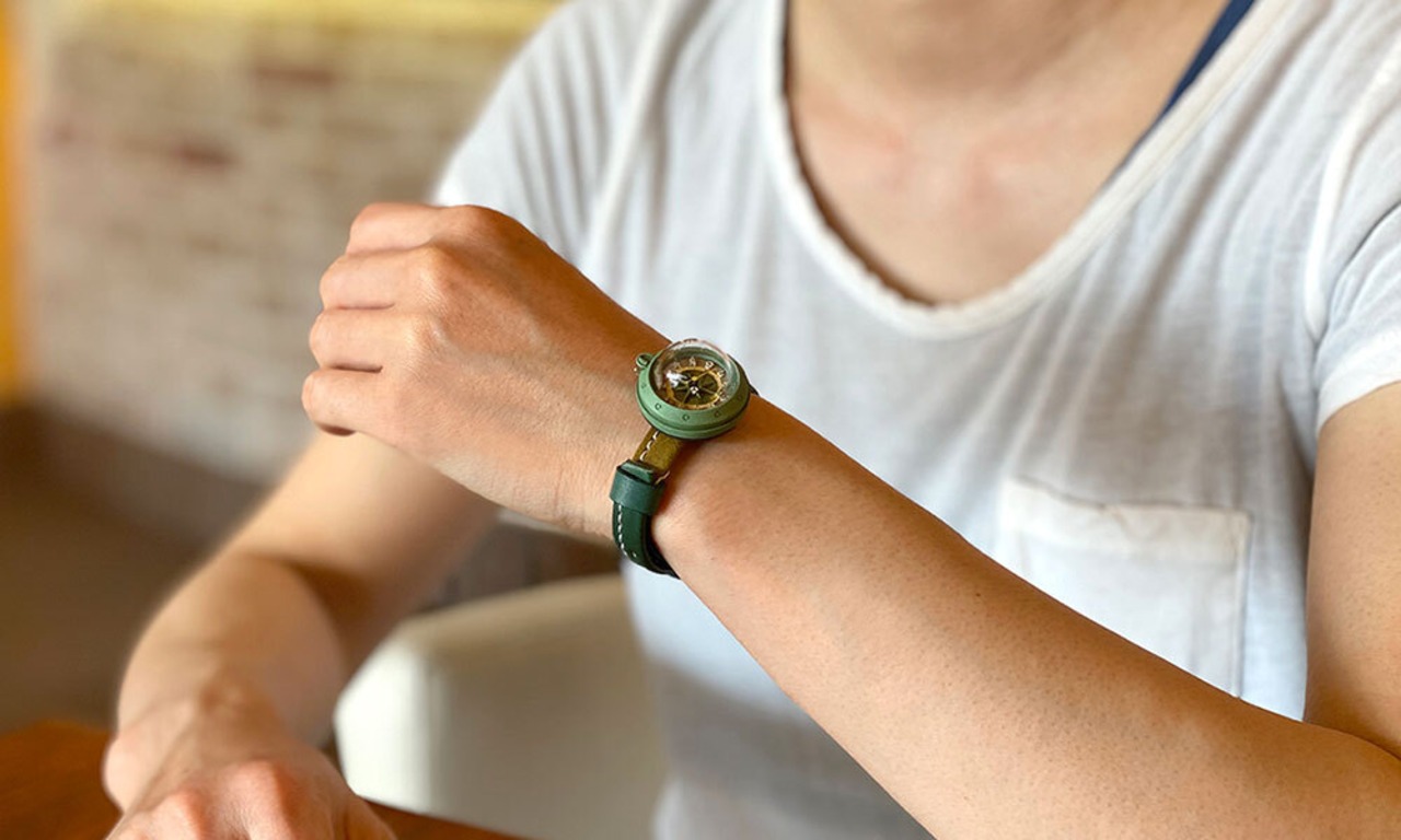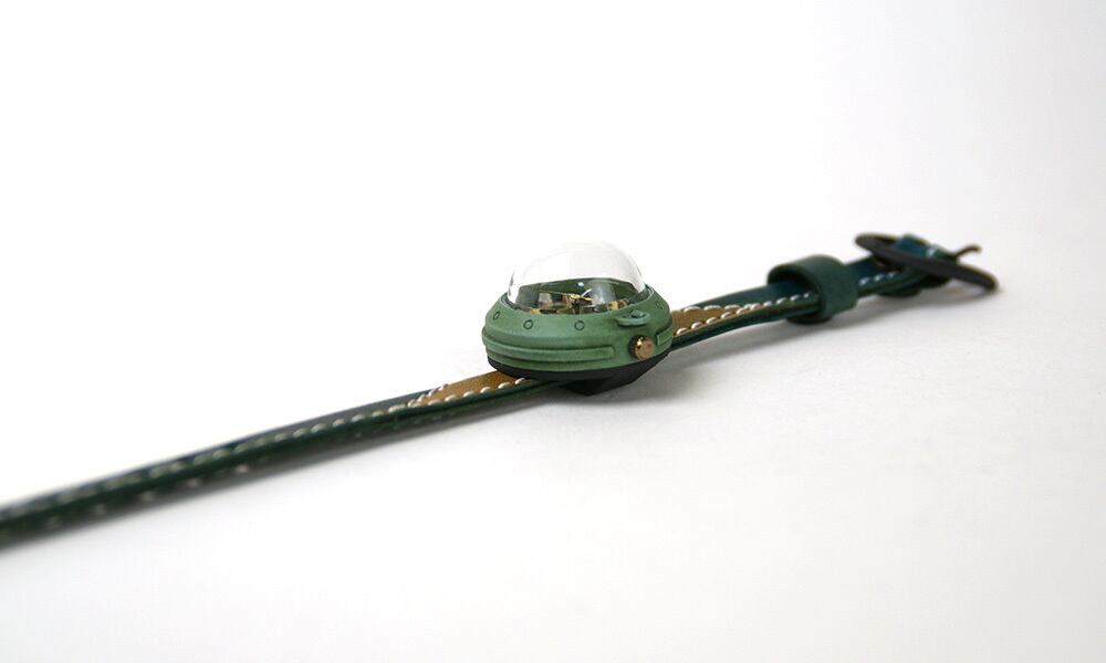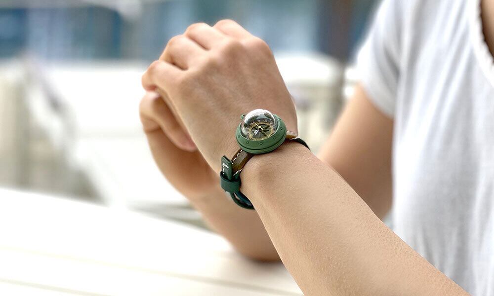 「時計本体」・・・船をイメージした時計本体には、船室の窓をイメージした半球型のレンズがついています。