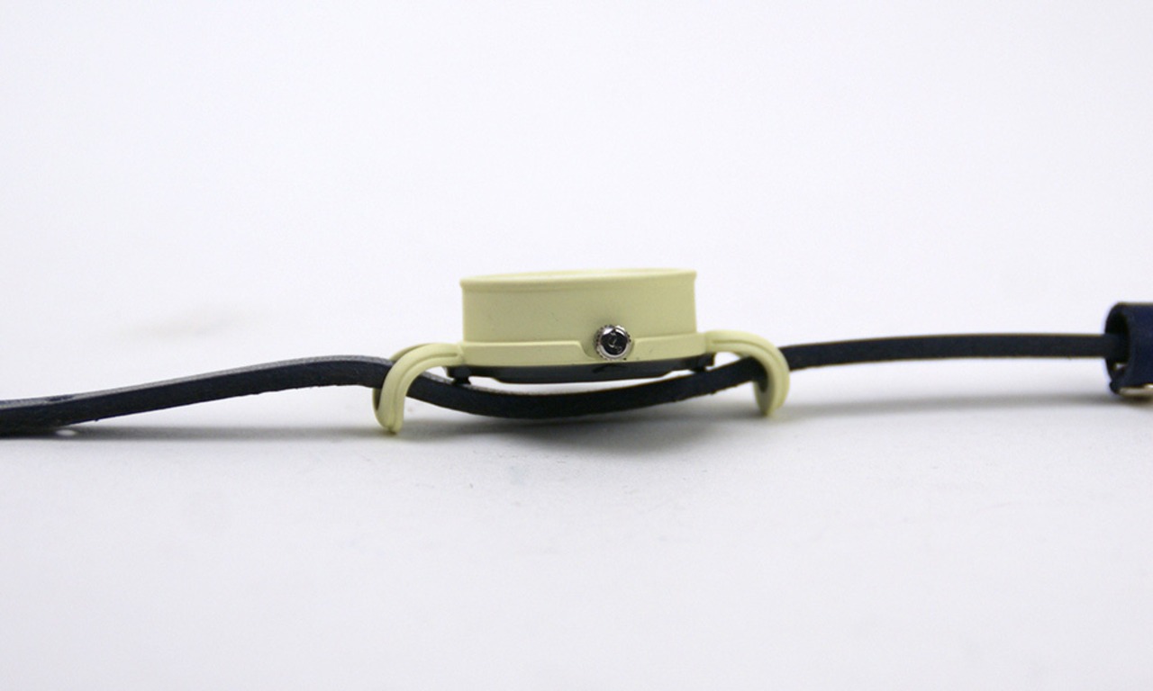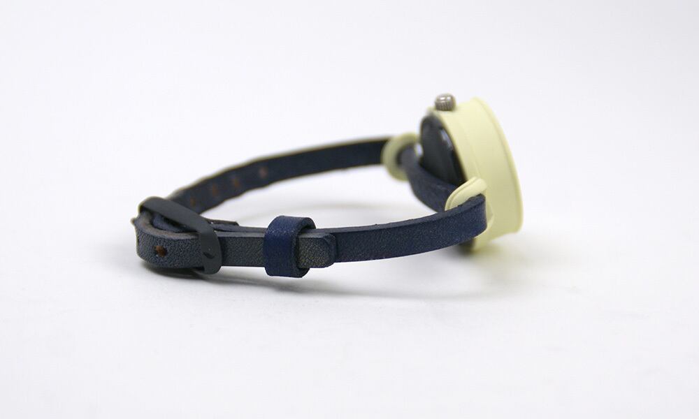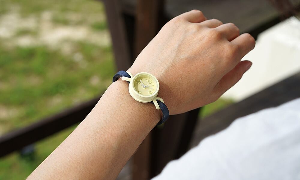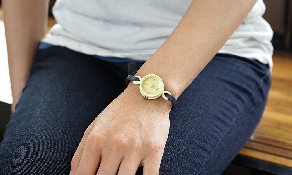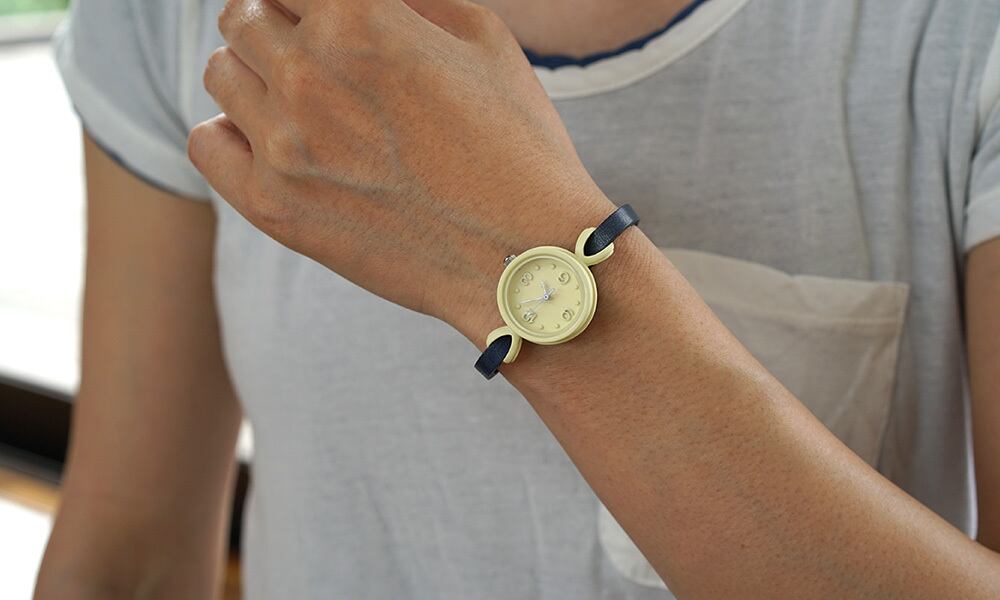 「本革ベルト」・・・幅5ミリの幅で切り出した華奢な革ベルトです。シンプルな時計に華奢なベルトを合わせることで、気軽につけられる雰囲気に仕上げました。