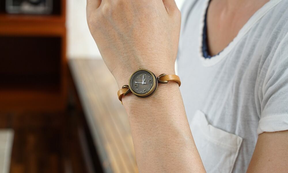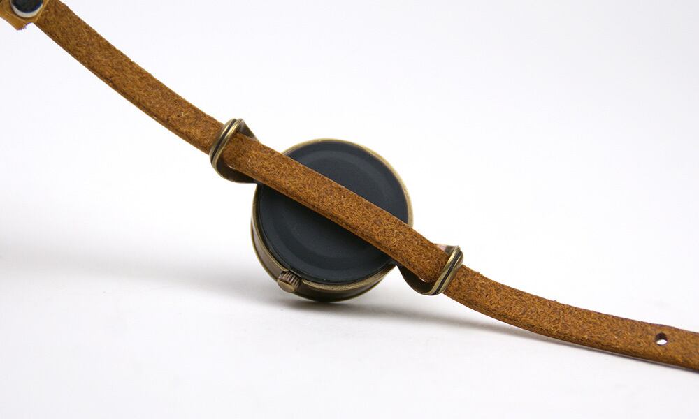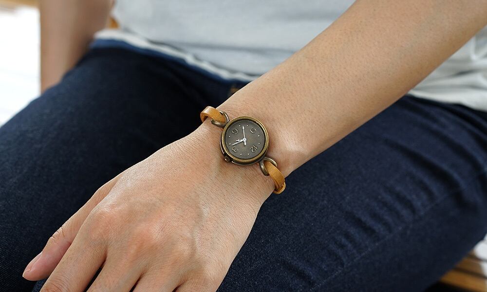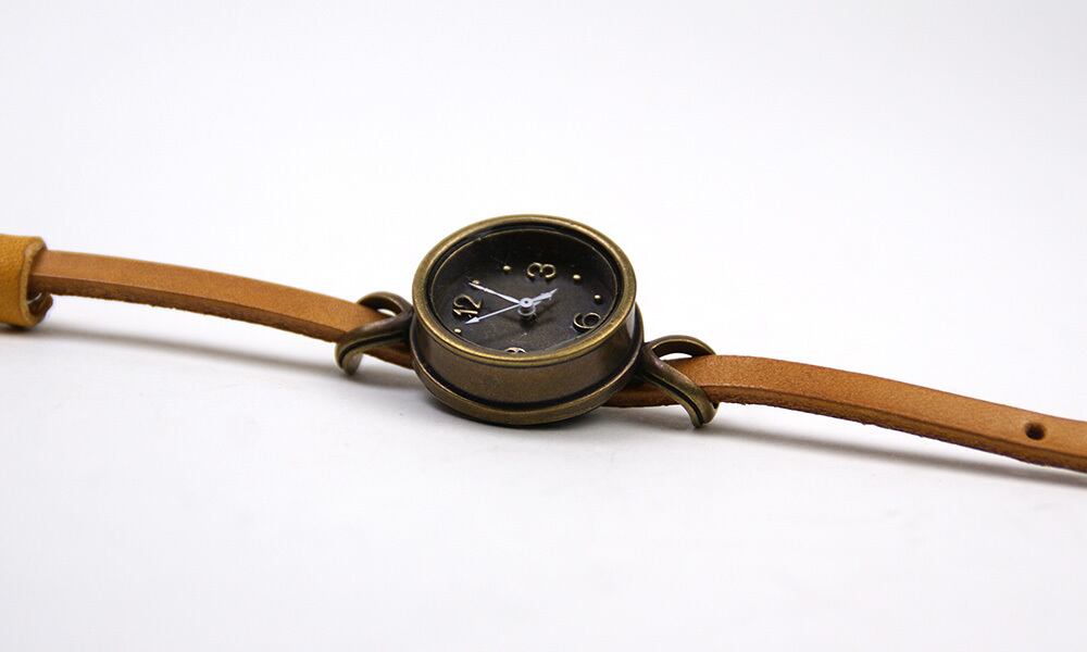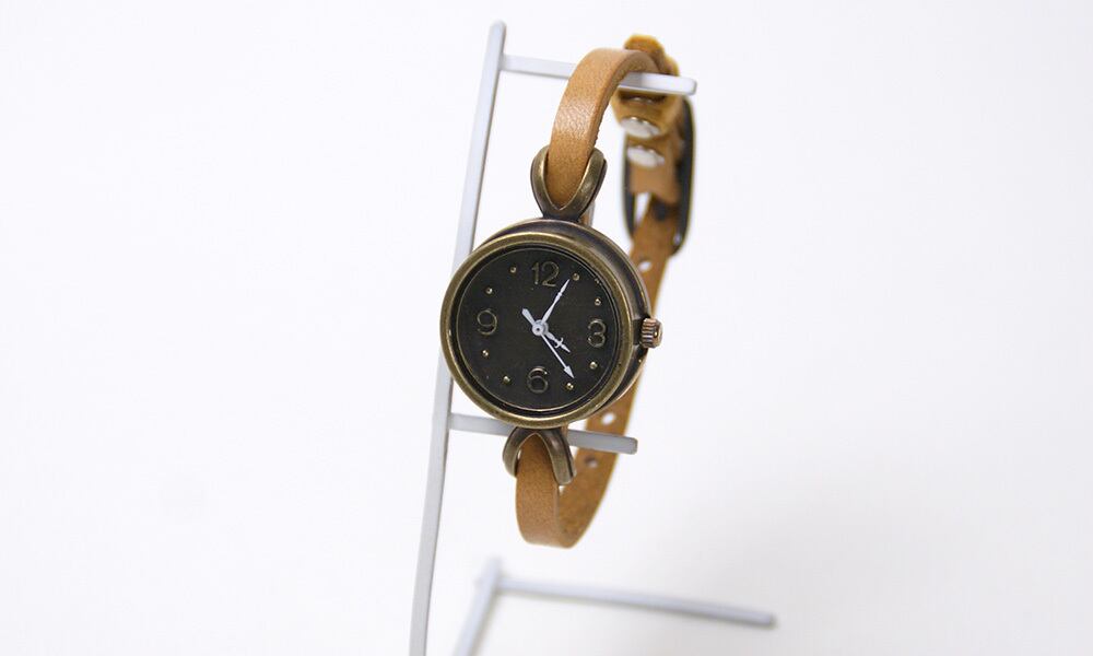 「本革ベルト」・・・幅5ミリの幅で切り出した華奢な革ベルトです。シンプルな時計に華奢なベルトを合わせることで、気軽につけられる雰囲気に仕上げました。