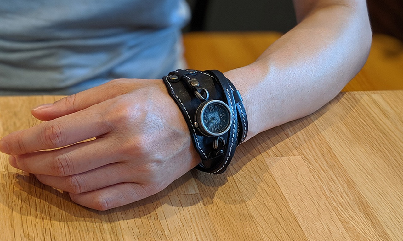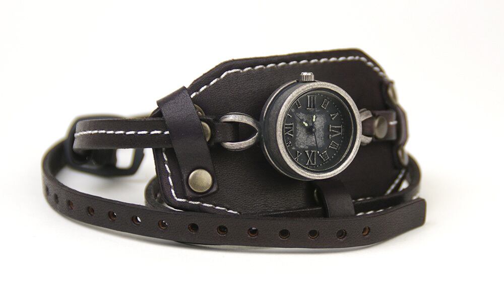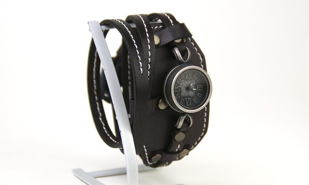 この時計のベルトは革ベルトの制作上の理由により、男性用フリーサイズで制作していますので、女性が着けられる際は恐れ入りますが、「女性用フリーサイズ」をお選びください