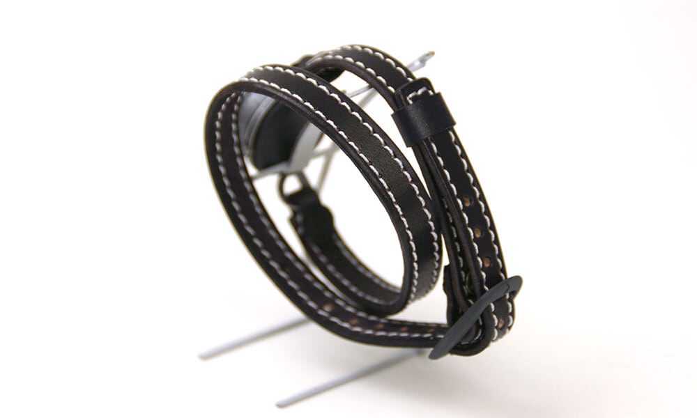 「2重巻きの本革ベルト」・・・本革から幅10ミリのベルトを切り出し、2重巻きにしています。その後、革ミシンでステッチを入れることで高級感を出しています。