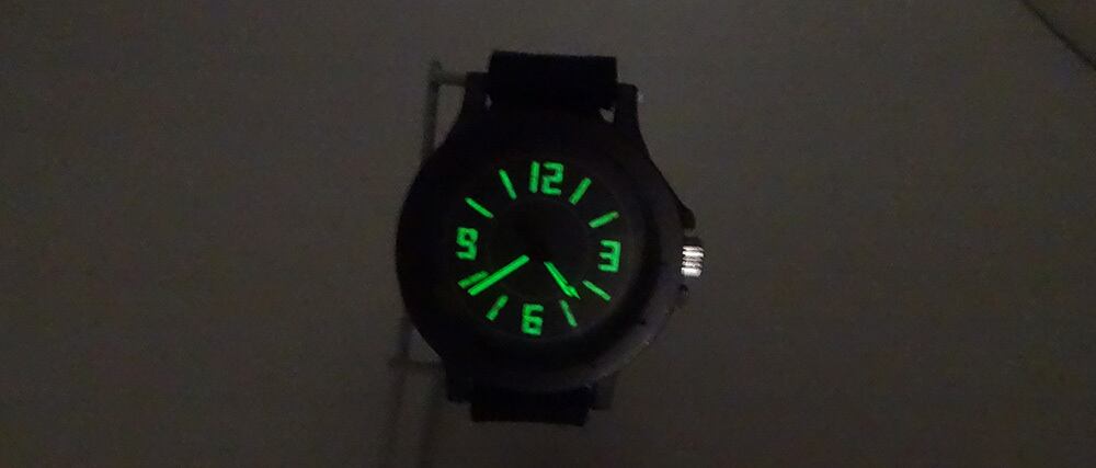 さらにこの時計の文字盤のインデックスが蓄光になっていますので、時計の針と一緒に、明るいところで光を蓄え、暗闇で光ります。