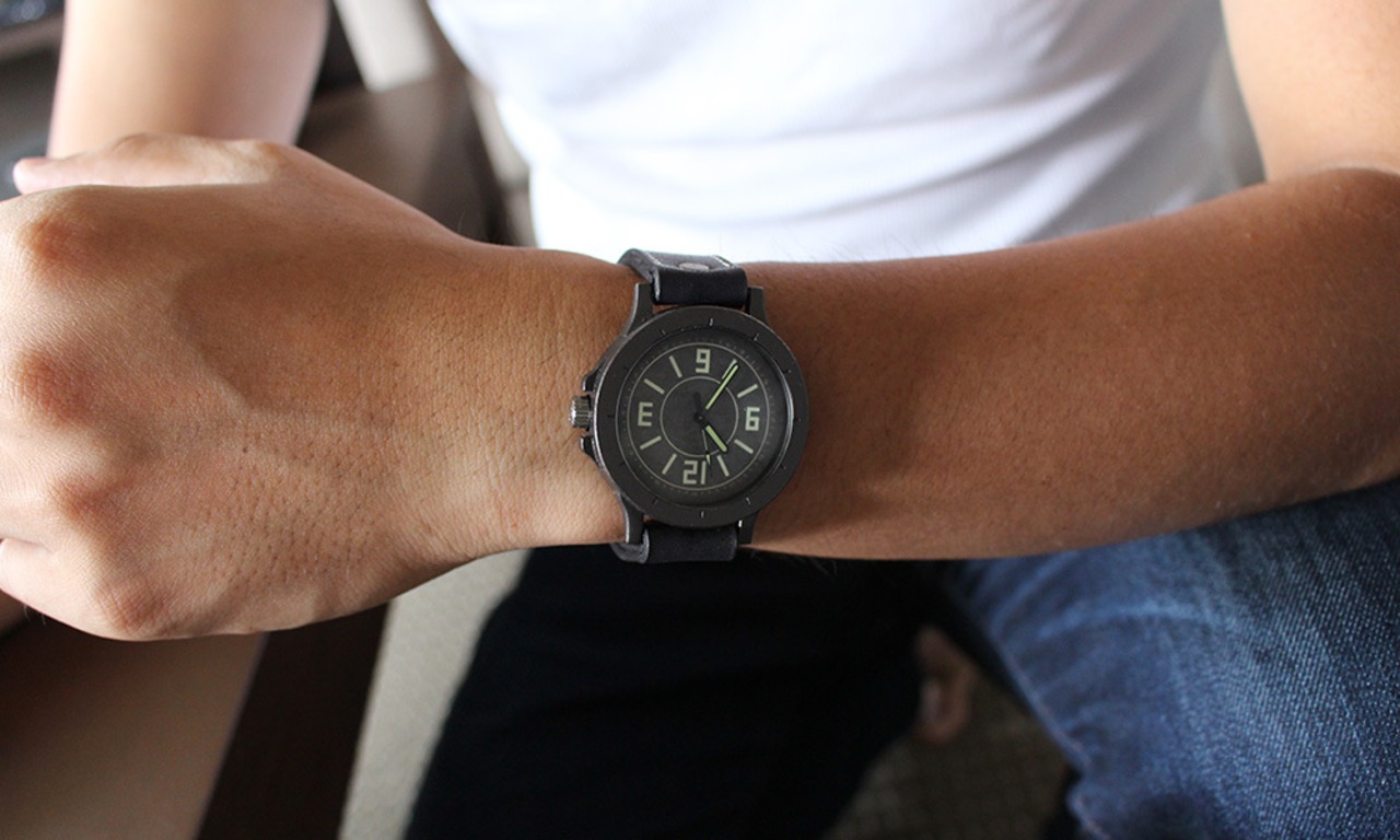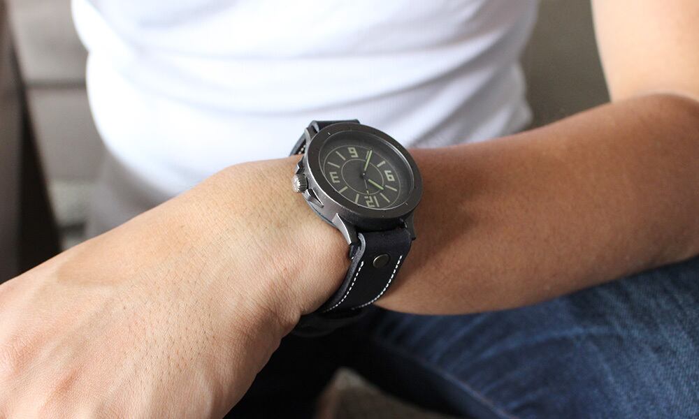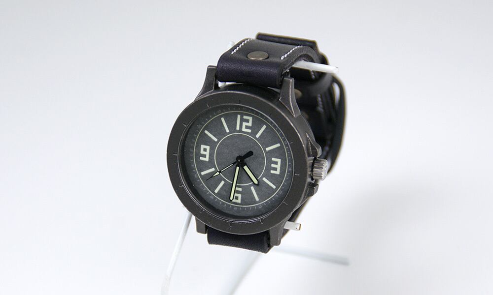 重厚な時計ケースに、シンプルで大きくて見やすい文字盤、蓄光部分の大きい針、分厚い本革ベルトを一つの腕時計につめこみました。