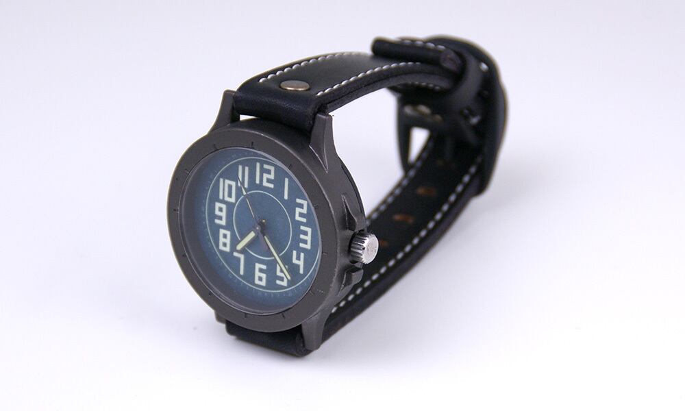 重厚な時計ケースに、シンプルで大きくて見やすい文字盤、蓄光部分の大きい針、分厚い本革ベルトを一つの腕時計につめこみました。