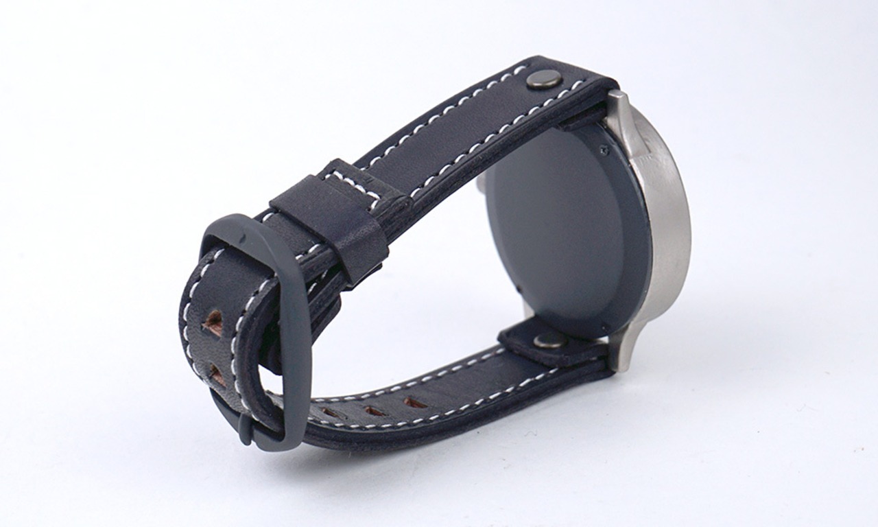 「時計本体」・・・大きめで分厚い重厚な時計ケースは、シンプルな形状ながら、リューズ周りのデザインや金具を出す位置やカーブなどの工夫を行うことで、スタイリッシュな印象に仕上げています。