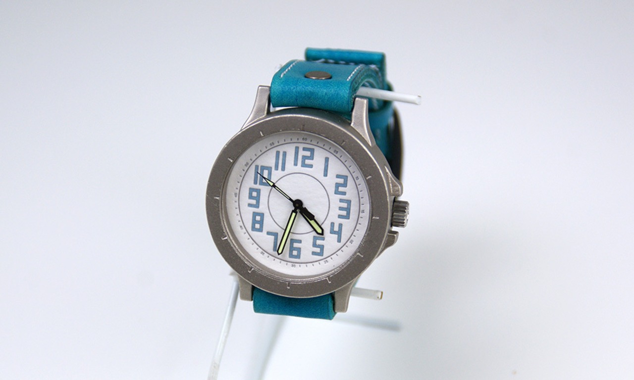 「文字盤」・・・ホワイトの下地に水色文字に黒の縁取りのインデックスを型押ししました。シンプルで、少し可愛らしいデザインですが、数字に黒の縁取りを加えることで、全体を引き締め、シャープな印象に加えました。