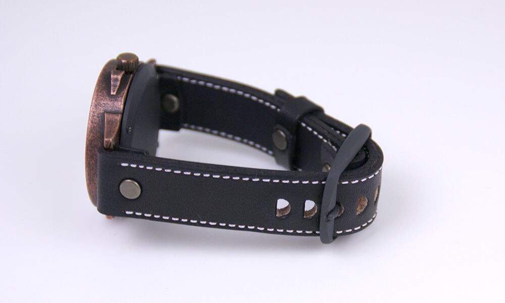「時計本体」・・・大きめで分厚い重厚な時計ケースは、シンプルな形状ながら、リューズ周りのデザインや金具を出す位置やカーブなどの工夫を行うことで、スタイリッシュな印象に仕上げています。