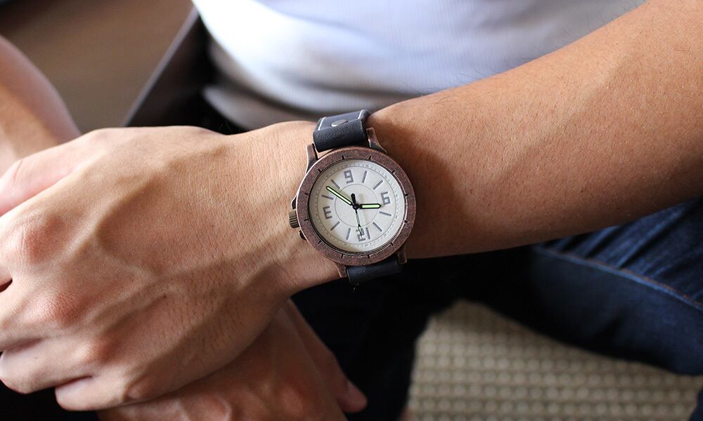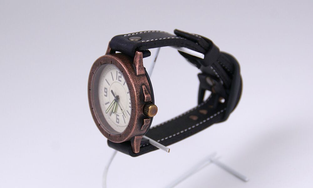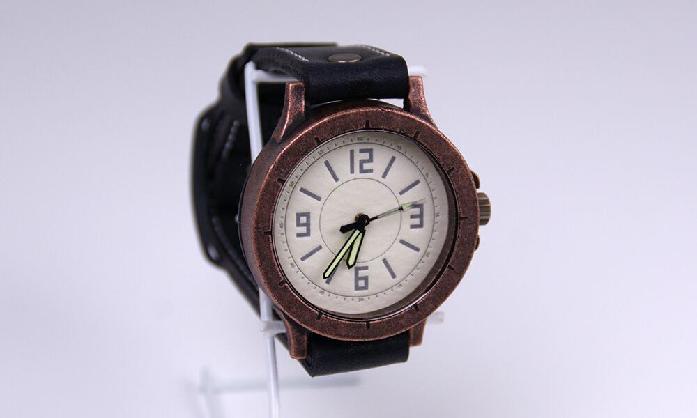 重厚な時計ケースに、シンプルで大きくて見やすい文字盤、蓄光部分の大きい針、分厚い本革ベルトを一つの腕時計につめこみました。